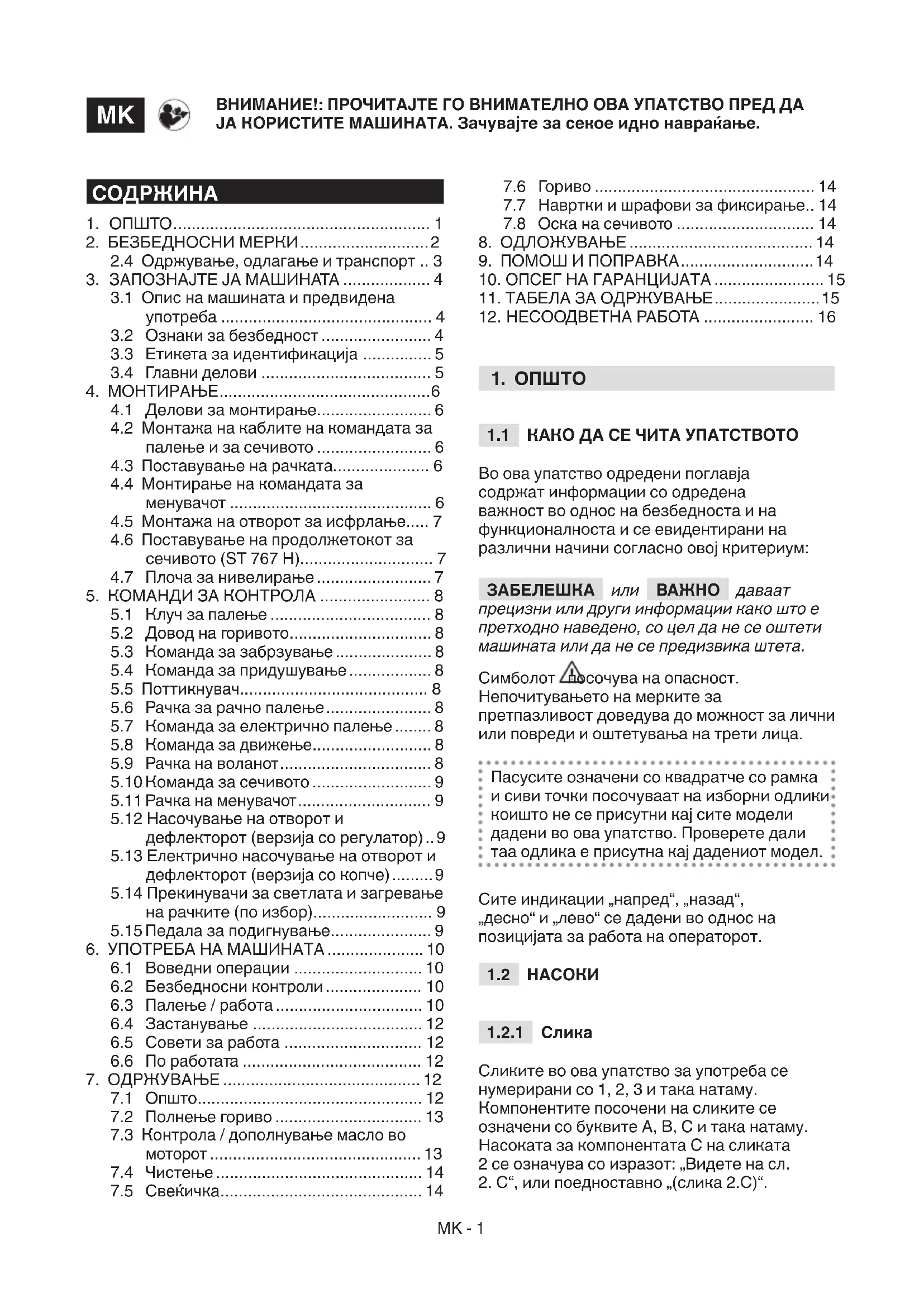 Ова упатство ги претставува сите неопходни индикации за управување со машината и за правилно одржување што гиMK - 15 извршува корисникот. Сите интервенции за регулација и одржување што не се опишани во ова упатство треба да ги спроведе застапникот или специјализиран сервисен центар бидејќи знаат како и ги имаат неопходните инструменти со коишто работата ќе се заврши правилно, земајќи го во предвид првобитниот степен на безбедност и условите на машината. Сите операции што се изведени на несоодветен начин и од неквалификувани лица придонесуваат да се изгуби секоја форма на гаранција и секој облик на обврска на производителот.