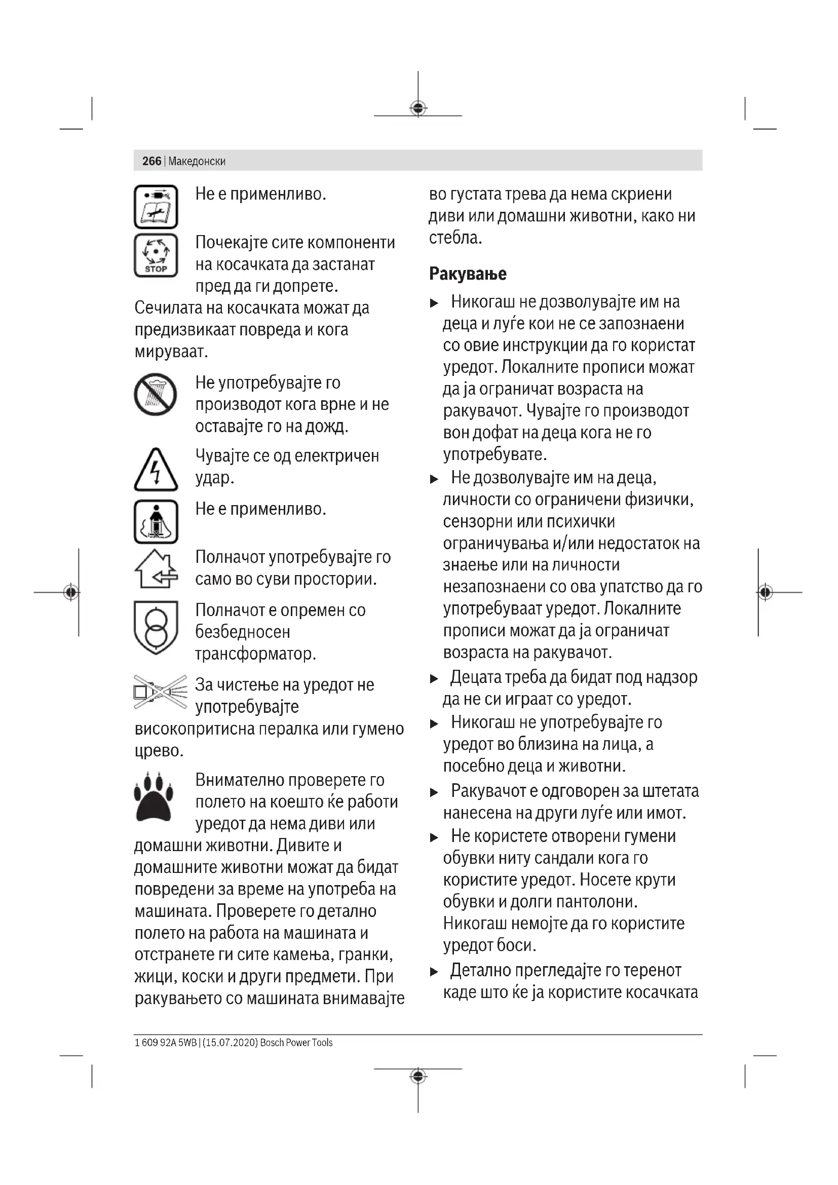 Bosch Power Tools 1 609 92A 5WB | (15.07.2020)266 | Македонски Не е применливо. Почекајте сите компоненти на косачката да застанат пред да ги допрете. Сечилата на косачката можат да предизвикаат повреда и кога