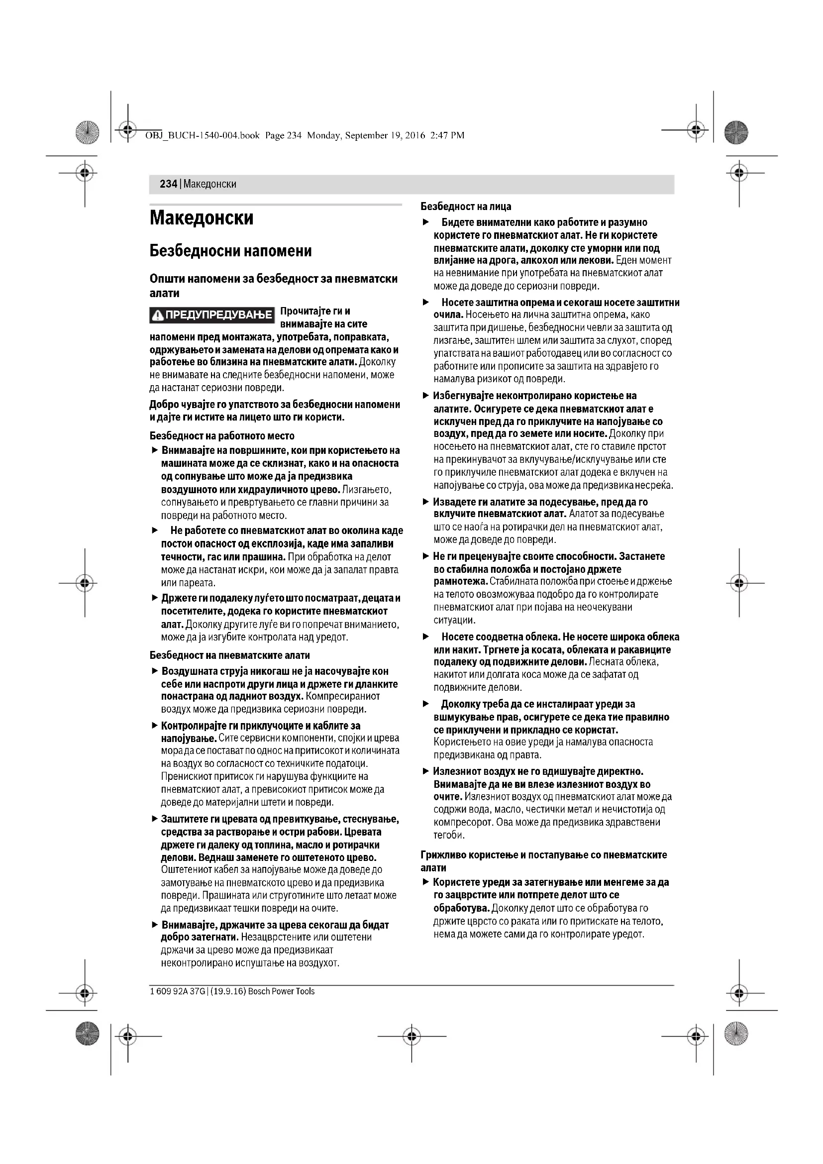 Воздушен притисок OBJ_BUCH-1540-004.book Page 236 Monday, September 19, 2016 2:47 PMМакедонски | 237 Bosch Power Tools 1 609 92A 37G | (19.9.16) Опис на производот и моќноста Прочитајте ги сите напомени и упатства за безбедност. Грешките настанати како резултат од непридржување до безбедносните напомени и упатства може да предизвикаат електричен удар, пожар и/или тешки повреди. Ве молиме отворете ја преклопената страница со приказ на пневматскиот алат, и држете ја отворена додека го читате упатството за употреба. Употреба со соодветна намена Пневматскиот алат е наменет за дупчење во дрво, метал, керамика и пластика. Илустрација на компоненти Нумерирањето на сликите со компоненти се однесува на приказот на графичката страница. Приказите се делумно шематски и може да отстапуваат кај вашиот пневматски алат. 1 Вретено за дупчење 2 Граница на затегање(на пр. за дополнителна дршка) 3 Прекинувач за вклучување/исклучување (лост) 4 Обрач за закачување 5 Спојница за црево 6 Површина на клучот на вретеното за дупчење 7 Прекинувач за вклучување/исклучување 8 Излез на воздух со придушувач 9 Дополнителна дршка* 10 Отвори за прицврстување на држачот за закачување 11 Држач за црево 12 Црево за одвод на воздух 13 Шраф за прицврстување за капакот на куќиштето 14 Капак на куќиштето 15 Излезен отвор за воздух со шестаголна навртка 16 Прстен за дихтување 17 Сет за издувен воздух (децентрално) 18 Приклучни додатоци на сетот за издувен воздух 19 Пригушувач на сетот за издувен воздух 20 Држачи за приклучокот за доводот за воздух 21 Црево за довод на воздух 22 Централно црево за одвод на воздух 23 Запчеста глава за дупчење 24 Брзозатегачка глава 25 Клуч за главата за дупчење 26 Прифат на алатот 27 Задна чаура 28 Предна чаура 29 Прекинувач за менување на правецот на вртење *Опишаната опрема прикажана на сликите не е дел од стандардниот обем на испорака. Комплетната опрема може да ја најдете во нашата Програма за опрема. Изјава за сообразност Тврдиме на наша одговорност, дека производот опишан во „Технички податоци“ е сообразен со сите релевантни одредби на директивата 2006/42/EG вклучително и нивните промени, како и со следните норми: EN ISO 11148-3. Техничка документација (2006/42/EC) при: Robert Bosch Power Tools GmbH, PT/ETM9, 70538 Stuttgart, GERMANY Robert Bosch Power Tools GmbH70538 Stuttgart, GERMANYStuttgart, 01.01.2017 Технички податоци