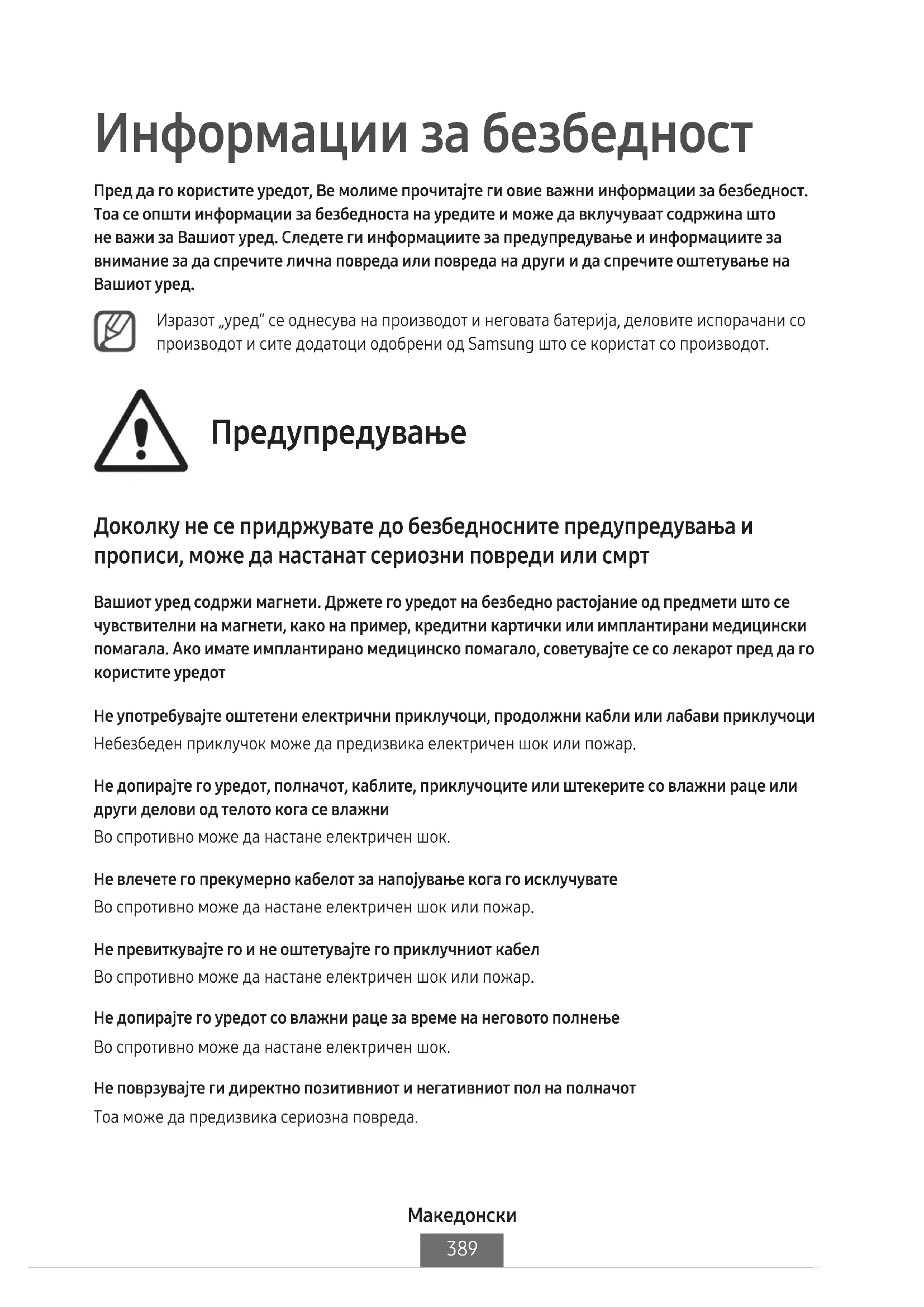 Информации за безбедност Пред да го користите уредот, Ве молиме прочитајте ги овие важни информации за безбедност. Тоа се општи информации за безбедноста на уредите и може да вклучуваат содржина што не важи за Вашиот уред. Следете ги информациите за предупредување и информациите за внимание за да спречите лична повреда или повреда на други и да спречите оштетување на Вашиот уред. Изразот „уред“ се однесува на производот и неговата батерија, деловите испорачани со производот и сите додатоци одобрени од Samsung што се користат со производот. Предупредување Доколку не се придржувате до безбедносните предупредувања и прописи, може да настанат сериозни повреди или смрт Вашиот уред содржи магнети. Држете го уредот на безбедно растојание од предмети што се чувствителни на магнети, како на пример, кредитни картички или имплантирани медицински помагала. Ако имате имплантирано медицинско помагало, советувајте се со лекарот пред да го користите уредот Не употребувајте оштетени електрични приклучоци, продолжни кабли или лабави приклучоци Небезбеден приклучок може да предизвика електричен шок или пожар. Не допирајте го уредот, полначот, каблите, приклучоците или штекерите со влажни раце или други делови од телото кога се влажни Во спротивно може да настане електричен шок. Не влечете го прекумерно кабелот за напојување кога го исклучувате Во спротивно може да настане електричен шок или пожар. Не превиткувајте го и не оштетувајте го приклучниот кабел Во спротивно може да настане електричен шок или пожар. Не допирајте го уредот со влажни раце за време на неговото полнење Во спротивно може да настане електричен шок. Не поврзувајте ги директно позитивниот и негативниот пол на полначот Тоа може да предизвика сериозна повреда.Македонски