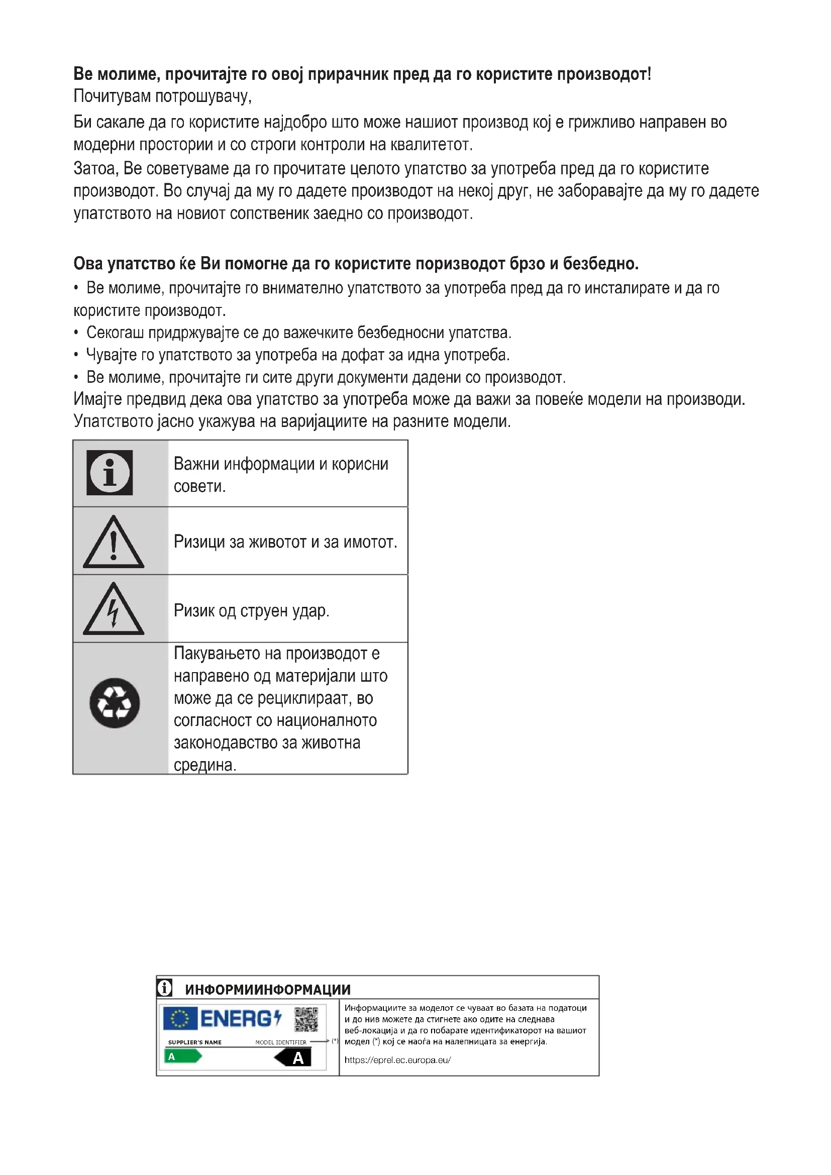 - Ве молиме, прочитајте го внимателно упатството за употреба пред да го инсталирате и да го користите производот.