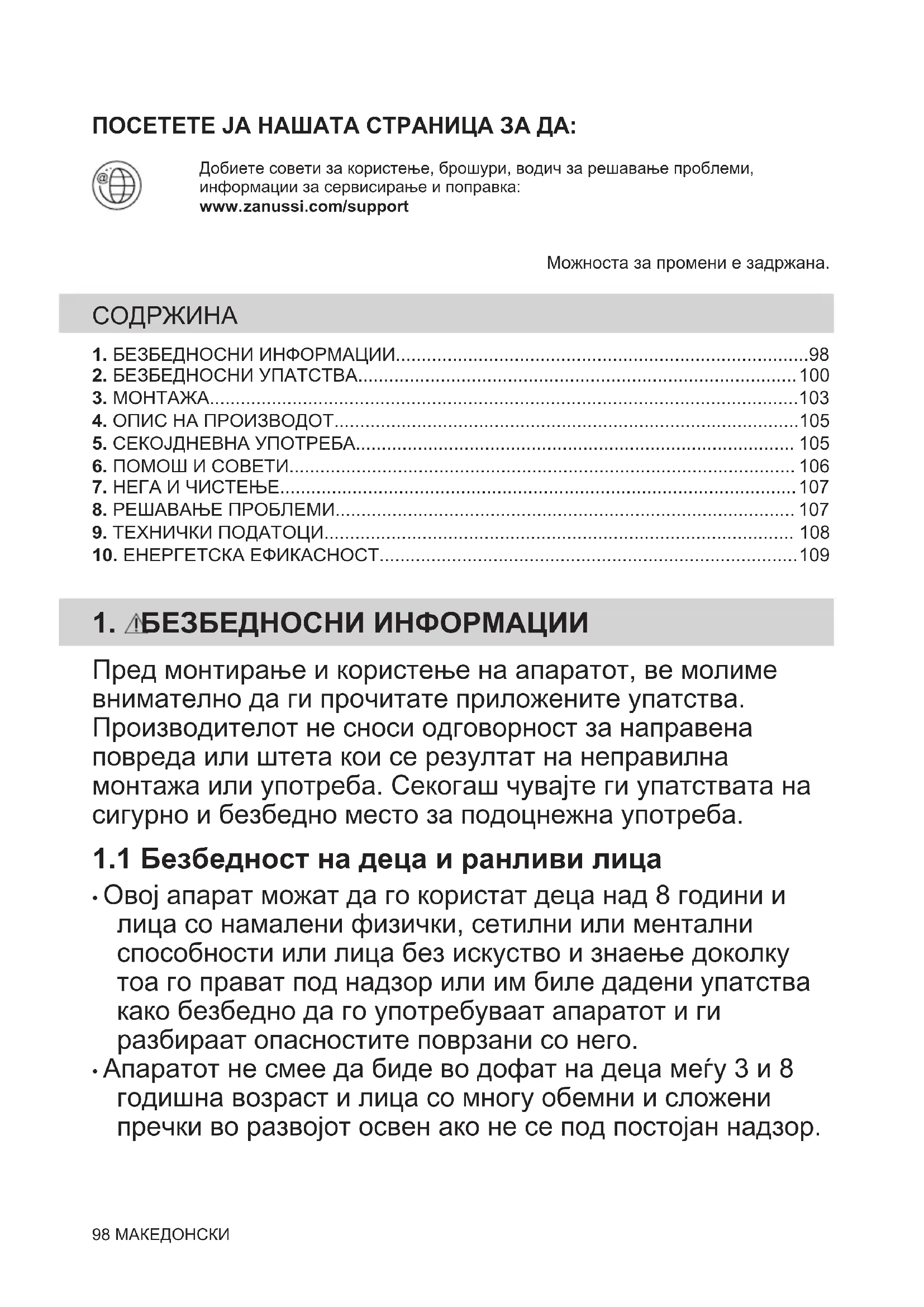 Рециклирајте ги материјалите со симболот . Ставете ја амбалажата во соодветни контејнери за да ја рециклирате. Помогнете во заштитата на живтната средина и човековото здравје и рециклирајте го отпадот од електрични и електронски апарати. Не фрлајте ги апаратите озанчени со симболот во отпадот од домаќинството. Вратете го производот во вашиот локален капацитет за рециклирање или контактирајте ја вашата општинска канцеларија. 110 МАКЕДОНСКИПОСЕТИТЕ НАШ ВЕБ-САЈТ ДА: Прибавите савете за коришћење, брошуре и информације за решавањепроблема, сервис и поправку:www.zanussi.com/supportЗадржано право измена.