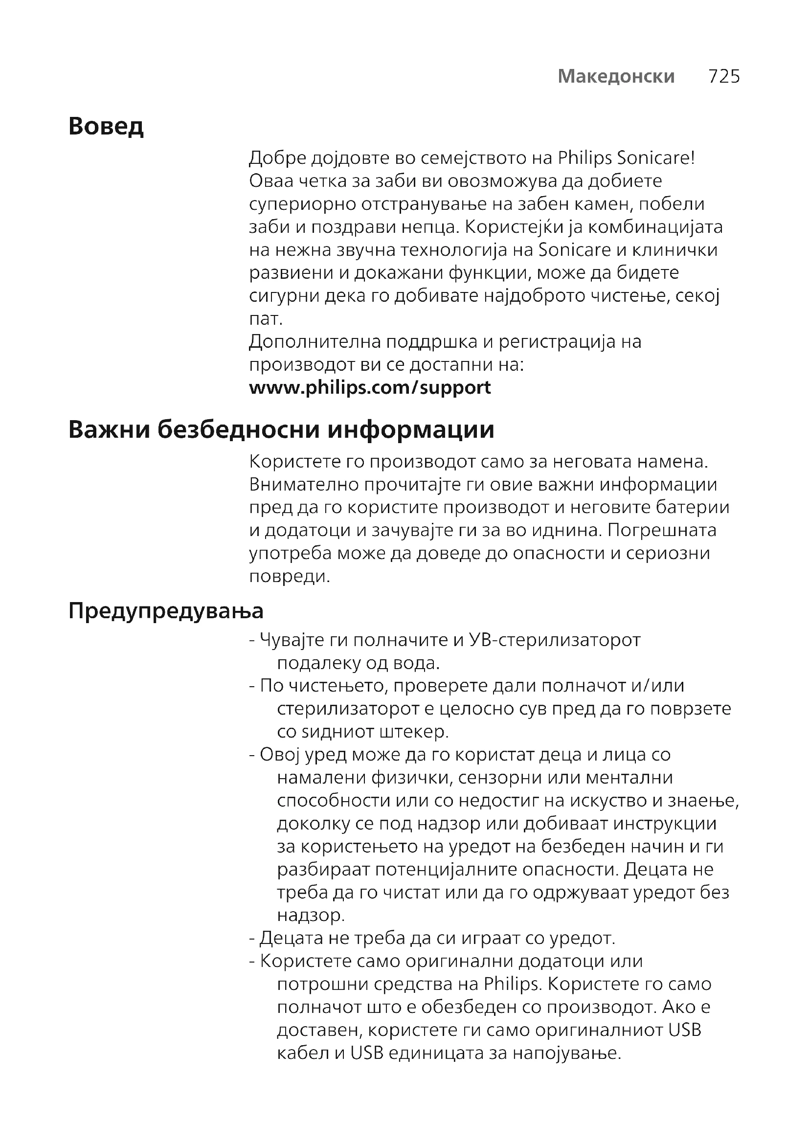 - Уредов е уред за лична нега и не е наменет за користење на повеќе пациенти во стоматолошка ординација или институција. Безбедносни упатства за батеријата - Овој уред содржи батерии на полнење што смеат да ги отстрануваат само обучени лица - Користете го производот само за неговата намена. Внимателно прочитајте ги овие информации пред да ги користите производот и неговите батерии и додатоци и зачувајте ги за во иднина. Погрешната употреба може да доведе до опасности и сериозни повреди. Доставените додатоци може да се разликуваат за различни производи. - Користете само оригинални додатоци и потрошни средства на Philips. Користете ја само единицата за напојување што се вади TCBxxxx, HX6100, HX6110, HX6160 или WAAxxxx. - Чувајте ги производот и батериите подалеку од оган и немојте да ги изложувате на директна сончева светлина или високи температури. - Ако производот се загрее премногу или почне да мириса, ја промени бојата или ако полнењето трае подолго од вообичаено, престанете со користењето и полнењето на производот и контактирајте со Philips. - Не ставајте ги производите и нивните батерии во микробранови печки или на индукциски шпорети. - Немојте да го отворате, изменувате, продупчувате, оштетувате или расклопувате производот или батеријата за да спречите батериите да се загреваат или да испуштаат токсични или опасни супстанции. Немојте да правите краток спој, премногу да ги наполнувате или обратно да ги полните батериите.728