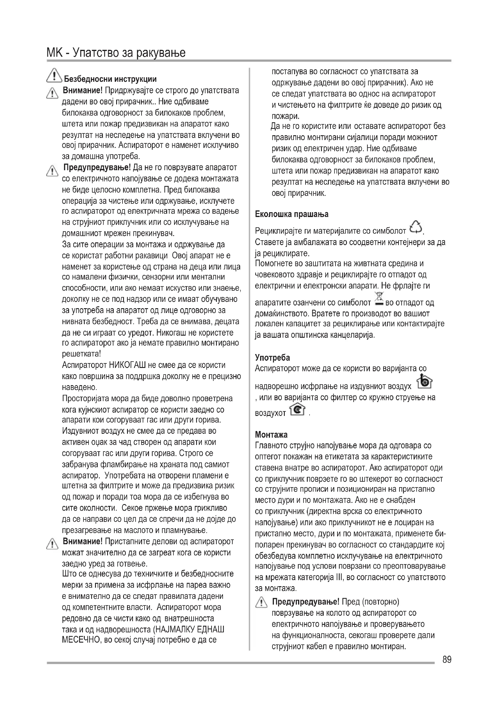 Да не го користите или оставате аспираторот без правилно монтирани сијалици поради можниот ризик од електричен удар. Ние одбиваме билокаква одговорност за билокаков проблем, штета или пожар предизвикан на апаратот како резултат на неследење на упатствата вклучени во овој прирачник. Eколошка прашања Рециклирајте ги материјалите со симболот
