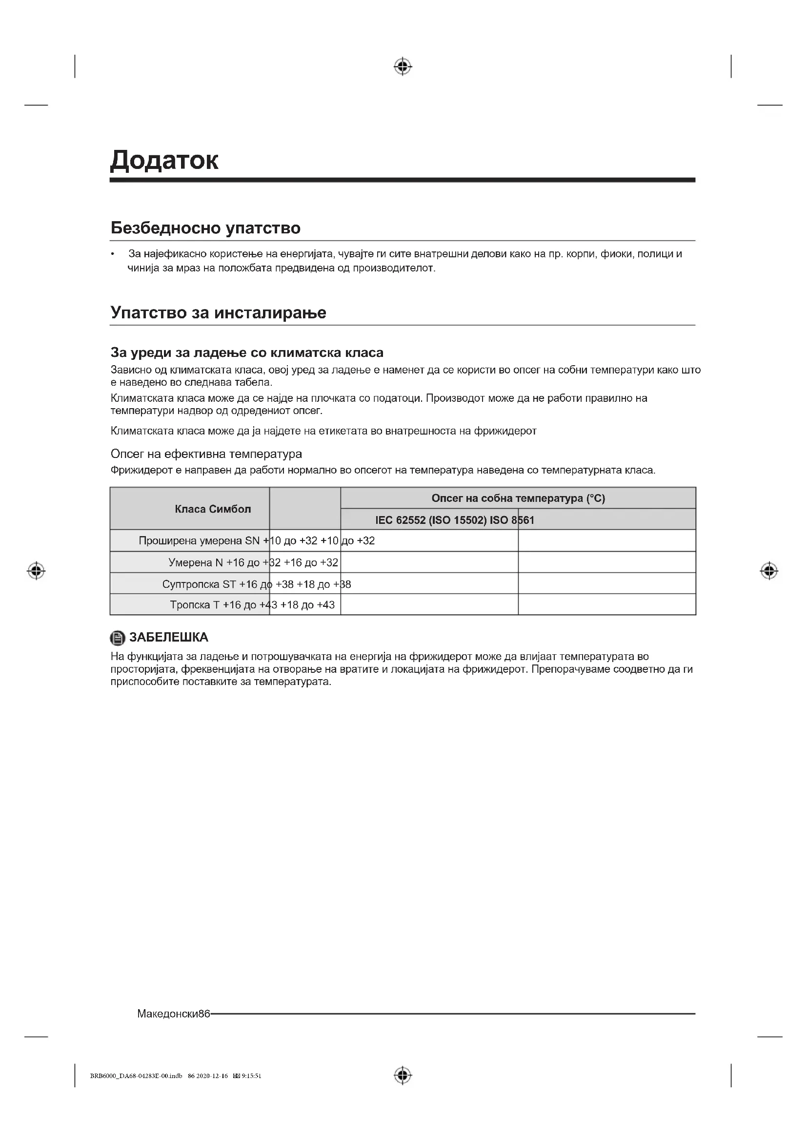 На функцијата за ладење и потрошувачката на енергија на фрижидерот може да влијаат температурата во просторијата, фреквенцијата на отворање на вратите и локацијата на фрижидерот. Препорачуваме соодветно да ги приспособите поставките за температурата. BRB6000_DA68-04283E-00.indb 86 2020-12-16 9:15:51Македонски 87 Упатство за температурите Препорачана температура Оптимално поставена температура за чување храна: