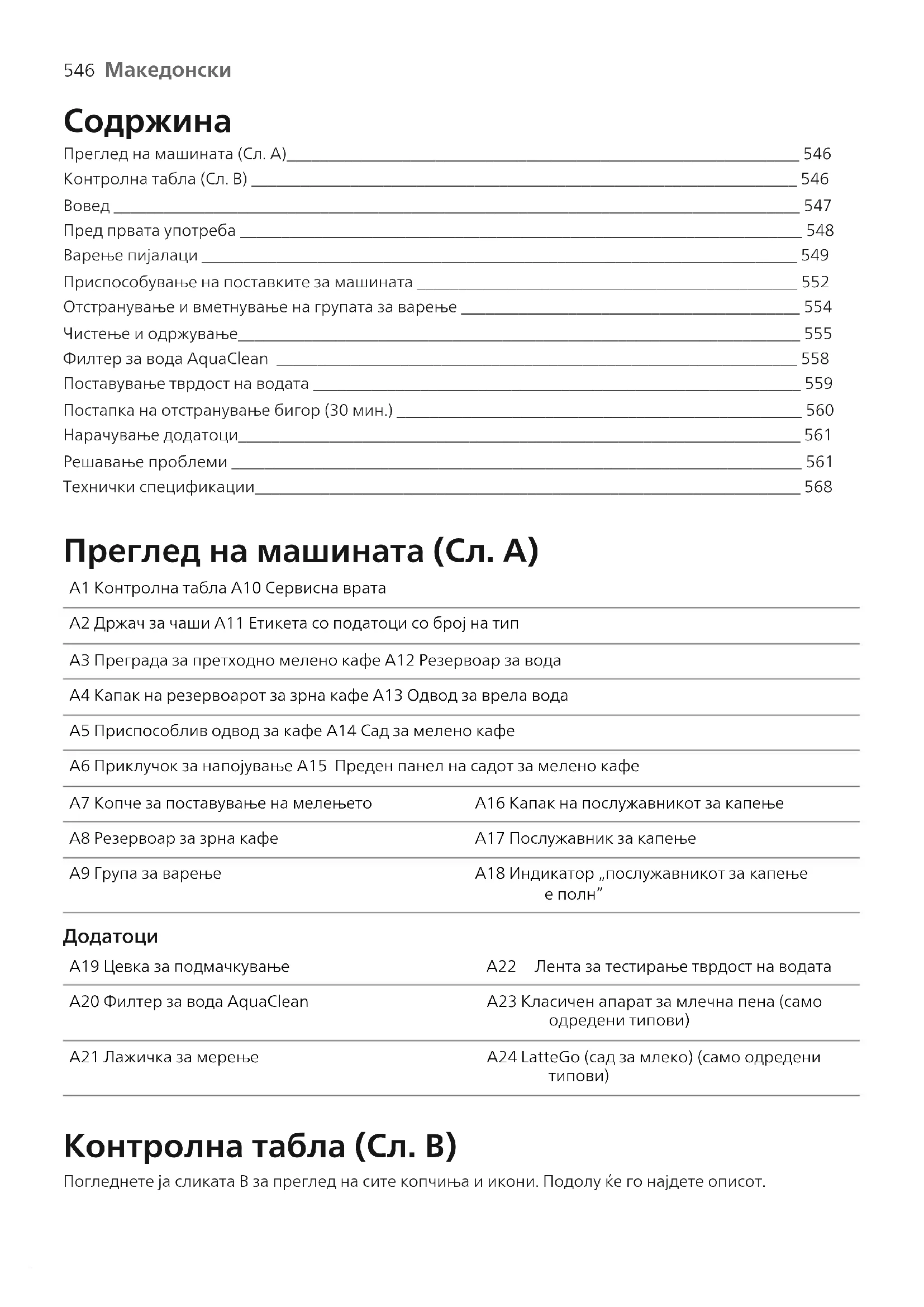 Преглед на машината (Сл. А)______________________________________________________________ 546 Контролна табла (Сл. B) __________________________________________________________________ 546 Вовед ___________________________________________________________________________________ 547 Пред првата употреба ____________________________________________________________________ 548 Варење пијалаци ________________________________________________________________________ 549 Приспособување на поставките за машината ______________________________________________ 552 Отстранување и вметнување на групата за варење _________________________________________ 554 Чистење и одржување____________________________________________________________________ 555 Филтер за вода AquaClean _______________________________________________________________ 558 Поставување тврдост на водата ___________________________________________________________ 559 Постапка на отстранување бигор (30 мин.) _________________________________________________ 560 Нарачување додатоци____________________________________________________________________ 561 Решавање проблеми _____________________________________________________________________ 561 Технички спецификации__________________________________________________________________ 568 Преглед на машината (Сл. А) A1 Контролна табла A10 Сервисна врата A2 Држач за чаши A11 Етикета со податоци со број на тип A3 Преграда за претходно мелено кафе A12 Резервоар за вода A4 Капак на резервоарот за зрна кафе A13 Одвод за врела вода A5 Приспособлив одвод за кафе A14 Сад за мелено кафе A6 Приклучок за напојување A15 Преден панел на садот за мелено кафе A7 Копче за поставување на мелењето A16 Капак на послужавникот за капење A8 Резервоар за зрна кафе A17 Послужавник за капење A9 Група за варење A18 Индикатор „послужавникот за капење