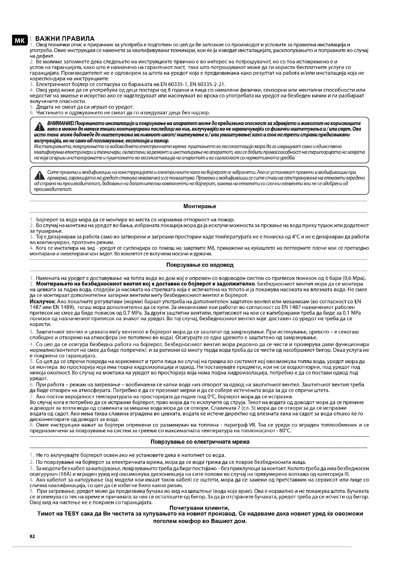3. За модели без кабел за напојување, поврзувањето треба да биде постојано – без приклучоци за контакт. Колото треба да има безбедносен осигурувач (16А) и вграден уред кој овозможува дисконекција на сите полови во случај на прекумерена волтажа од категорија III. 4. Ако кабелот за напојување (кај модели кои имаат таков кабел) се оштети, мора да се замени од претставник на сервисот или лице со слична квалификација, со цел да се избегне било каков ризик. 5. При загревање, уредот може да предизвика бучава во вид на шиштење (вода која врие). Ова е нормално и не покажува штета. Бучавата се зголемува со тек на време и причината за неа се остатоците од бигор. За да ја отстраните бучавата, уредот треба да се исчисти од бигор. Овој вид на чистење не е покриен со гаранцијата. Почитувани клиенти, Тимот на TESY сака да Ви честита за купувањето на новиот производ. Се надеваме дека новиот уред ќе овозможи поголем комфор во Вашиот дом.83Македонски