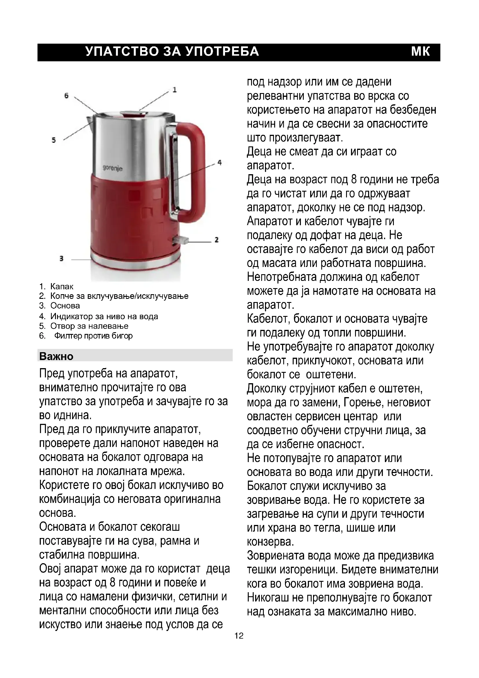 Кабелот, бокалот и основата чувајте ги подалеку од топли површини. Не употребувајте го апаратот доколку кабелот, приклучокот, основата или бокалот се оштетени. Доколку струјниот кабел е оштетен, мора да го замени, Горење, неговиот овластен сервисен центар или соодветно обучени стручни лица, за да се избегне опасност. Не потопувајте го апаратот или основата во вода или други течности. Бокалот служи исклучиво за зовривање вода. Не го користете за загревање на супи и други течности или храна во тегла, шише или