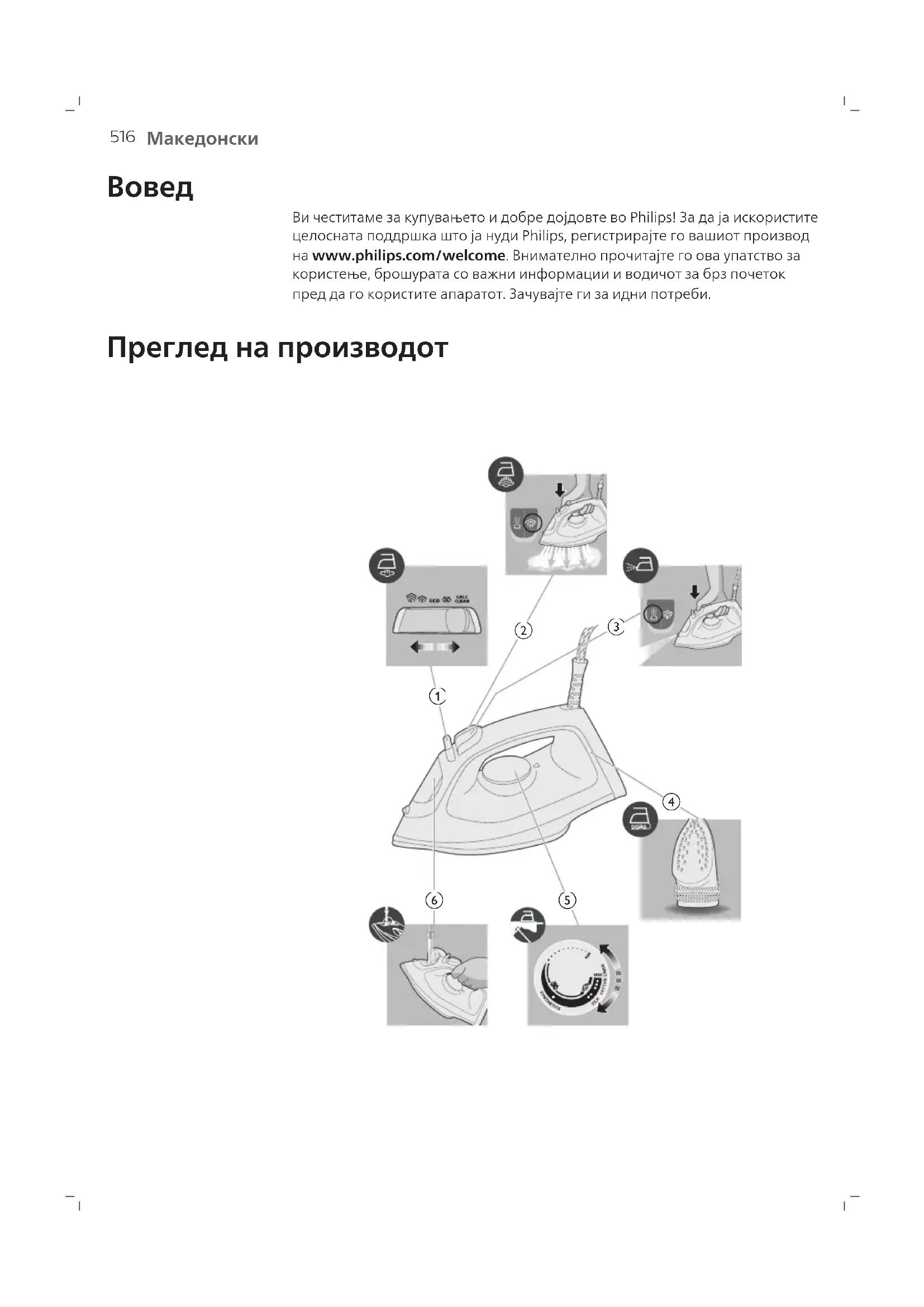 Ви честитаме за купувањето и добре дојдовте во Philips! За да ја искористите целосната поддршка што ја нуди Philips, регистрирајте го вашиот производ на www.philips.com/welcome. Внимателно прочитајте го ова упатство за користење, брошурата со важни информации и водичот за брз почеток пред да го користите апаратот. Зачувајте ги за идни потреби. Преглед на производот