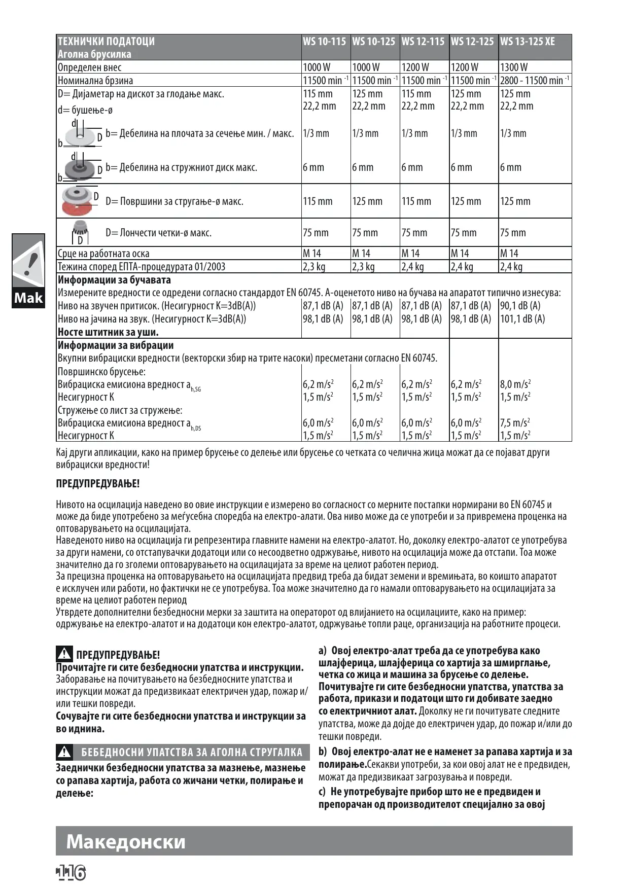 a) Овој електро-алат треба да се употребува како шлајферица, шлајферица со хартија за шмирглање, четка со жица и машина за брусење со делење. Почитувајте ги сите безбедносни упатства, упатства за работа, прикази и податоци што ги добивате заедно со електричниот алат. Доколку не ги почитувате следните упатства, може да дојде до електричен удар, до пожар и/или до тешки повреди. b) Овој електро-алат не е наменет за рапава хартија и за полирање.Секакви употреби, за кои овој алат не е предвиден, можат да предизвикаат загрозувања и повреди. c) Не употребувајте прибор што не е предвиден и препорачан од производителот специјално за овој електро-алат. Доколку извесен прибор можете да го прицврстите на вашиот електричен алат, тоа не претставува гаранција за сигурно употреба. d) Бројот на вртежи на алатот, којшто се употребува, мора да биде нај-малку толку висок како и бројот на вртежите на вашиот електро-алат. Додатокот, којтшто се врти побрзу, може да се скриша и да излета. e) Надворешниот дијаметар и дебелината на приборот мора да соодветствуваат со податоците за димензиите на вашиот електро-алат. Приборите со несоодветна димензија не можат да бидат соодветно заштитени или контролирани. f) Навоите на деловите од приборот мора да се совпаѓаат со навојот на осовината за брусење. Кај деловите од приборот кои што се приспојуваат, бушењето за трнот за натегнување во делот од приборот мора да се совпаѓа со пресекот на фланшот за локализирање. Делови од приборот кои што не пасуваат на монтажниот трн на апаратот, работат ексцентрично, вибрираат прекумерно силно и можат да доведат до загуба на контролата врз орудието. g) Не употребувајте оштетен прибор. Пред секоја употреба извршете контрола, како на пример на дисковите за брусење по однос на расцепи и пукнатини, на подножјата за брусење по однос на пукнатини, изабаност или голема искористеност, на четките со жици по однос на лабави или скршени жици. Ако електро-алатот или приборот паднат, проверете, дали тие се оштетени или употребете неоштетен прибор. Ако приборот сте го провериле и го употребувате, тогаш вие и лицата, кои се наоѓаат во близина, треба да бидете вон доменот на ротирачкиот прибор и оставете го приборот да работи една минута со максимален број на вртежи. Оштетениот прибор најчесто се крши во овој тест-период. h) Носете опрема за лична заштита. Зависно од употребата, користете целосна визуелна заштита, заштита за очите или заштитни очила. Доколку е потребно, носете маска за заштита од прашина, заштита за ушите, заштитни ракавици или специјална престилка, со која се заштитувате од ситни честички од шлајфувањето и од материјалот. Очите треба да бидат заштитени од страни тела што се разлетуваат наоколу, а кои настануваат при различни употреби. Заштита маска од прашина и за дишење мора да ја филтрираат прашината што се создава при работата. Доколку сте подолго време изложени на гласна бучава, тоа може да предизвика губење на слухот.