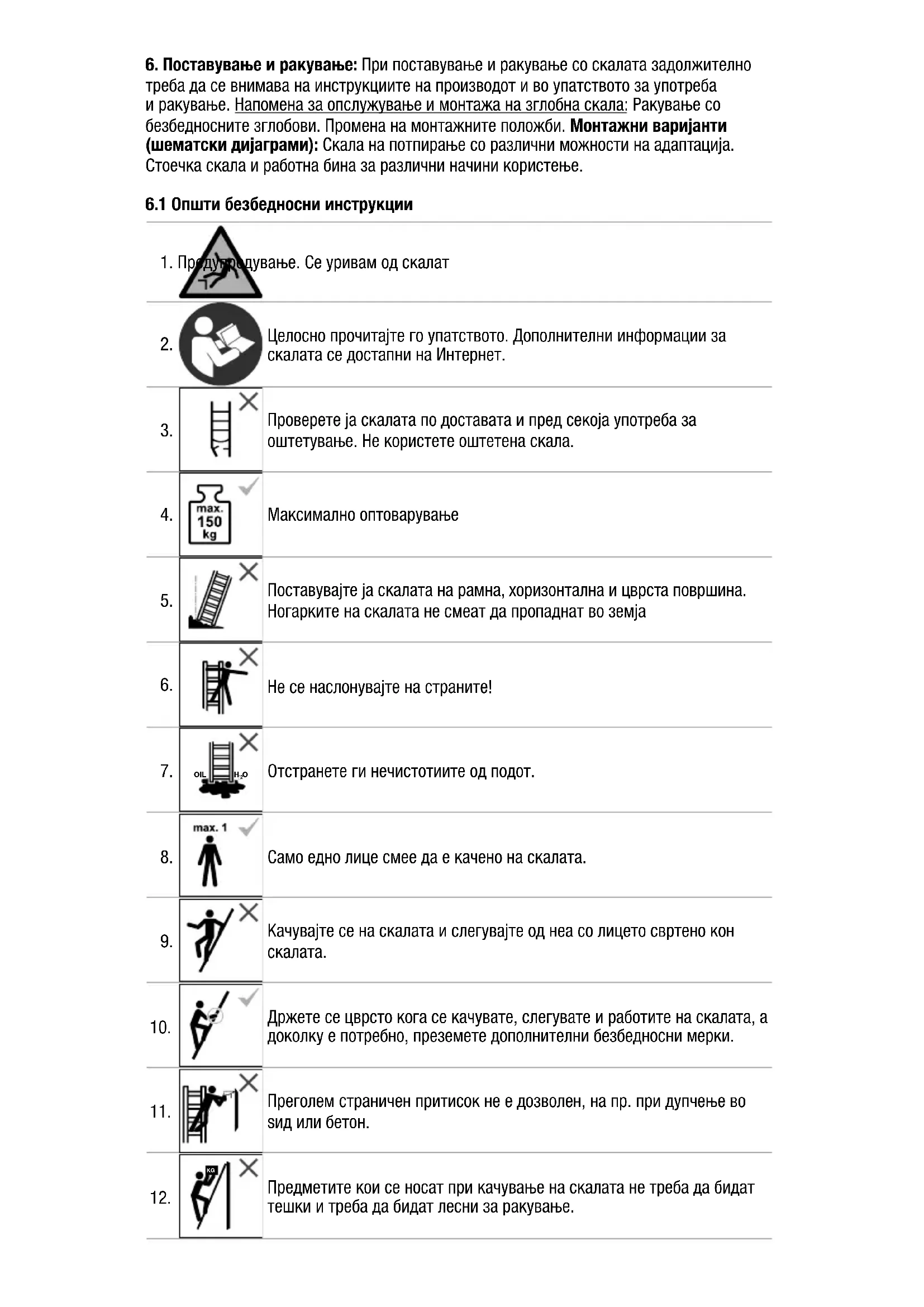 нејзиното правилно функционирање. Скалата мора редовно да се проверува за оштетување. Мора да се осигури функцијата на подвижните делови. Подвижните делови мора редовно да се подмачкуваат. Поправките на скалата мора да ја врши стручно лице и во согласност со упатствата на производителот. Чистењето на скалата при видливи нечистотии, особено на сите подвижни делови, треба да се врши веднаш по употребата. Користете само комерцијални детергенти растворливи во вода. Не користете агресивни абразивни средства. Во случај на комерцијална употреба на скалата, задолжителна е редовна, повторлива проверка на законски соодветната состојба од страна на квалификувано лице (визуелна и функционална проверка). Притоа се наведуваат видот, обемот и роковите на потребните проверки. Временските интервали за испитувањето се одредуваат според условите за работа, особено според зачестеноста на употреба, оптоварувањето за време на употребата и зачестеноста и сериозноста на откриените недостатоци за време на претходните проверки. Претприемачот, исто така, мора да се осигура дека неисправната скала е тргната од употреба и се чува на начин така што не можа да се употребува повторно додека не биде соодветно поправена или отстранета.8. Складирање: За да се избегне каква било штета, скалата мора да биде безбедно прицврстена за време на транспорт (на пр. на кровен носач или во автомобилот). Складирањето на скалата треба да се врши вертикално во сува средина, лежејќи рамно или висејќи на ѕидот на соодветен ѕиден држач. Секоја штета мора да се исклучи и сите делови мора да бидат заштитени од атмосферски влијанија. Скалата мора да се чува заштитена од играње на деца и за да не се повреди никој (можна опасност од сопнување). Дополнително, таа треба да се чува на таков начин што не може да се користи/искористува за криминални цели.