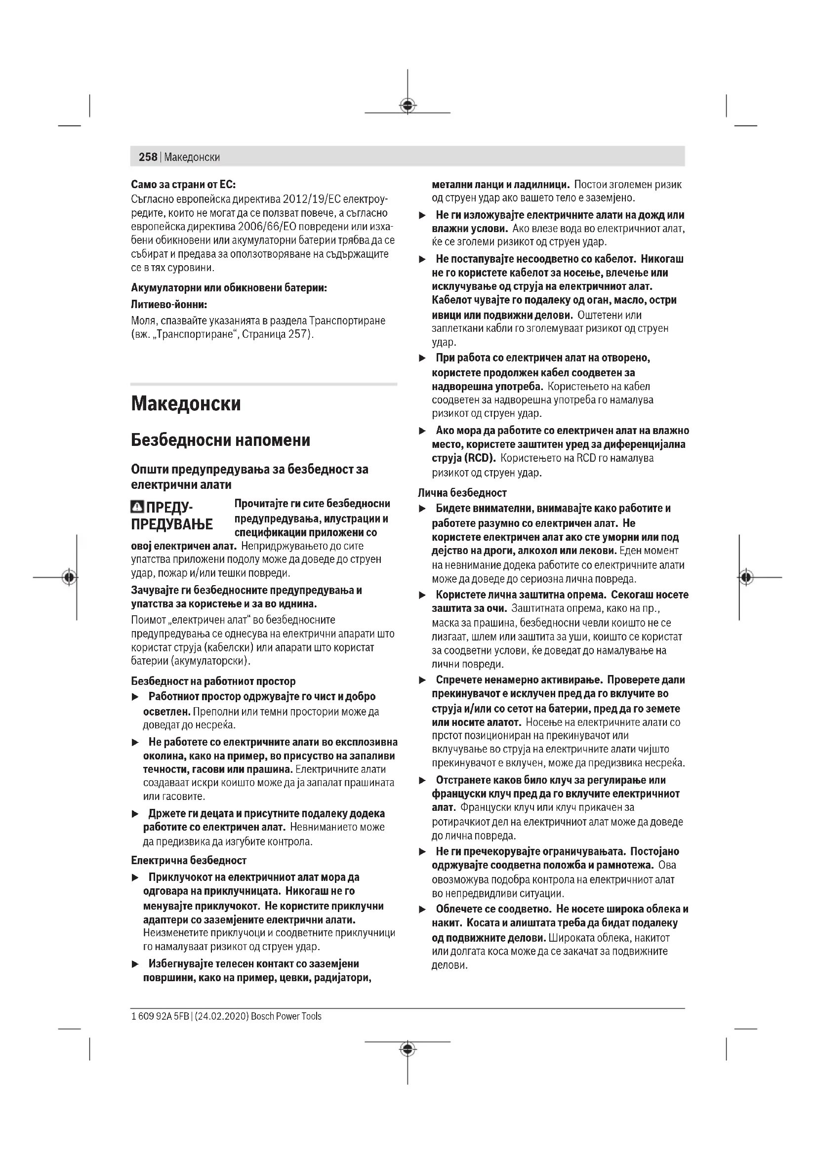 1 609 92A 5FB | (24.02.2020) Bosch Power ToolsМакедонски | 259 u Ако се користат поврзани уреди за вадење прашина и собирање предмети, проверете дали се правилно поврзани и користени. Собирањето прашина може да ги намали опасностите предизвикани од неа. u Не дозволувајте искуството стекнато со честа употреба на алатите да ве направи спокојни и да ги игнорирате безбедносните принципи при нивното користење. Невнимателно движење може да предизвика сериозна повреда во дел од секунда. Употреба и чување на електричните алати u Не го преоптоварувајте електричниот алат. Користете соодветен електричен алат за намената. Со соодветниот електричен алат подобро, побезбедно и побрзо ќе ја извршите работата за која е наменет. u Не користете електричен алат ако не можете да го вклучите и исклучите со помош на прекинувачот. Секој електричен алат којшто не може да се контролира со прекинувачот е опасен и мора да се