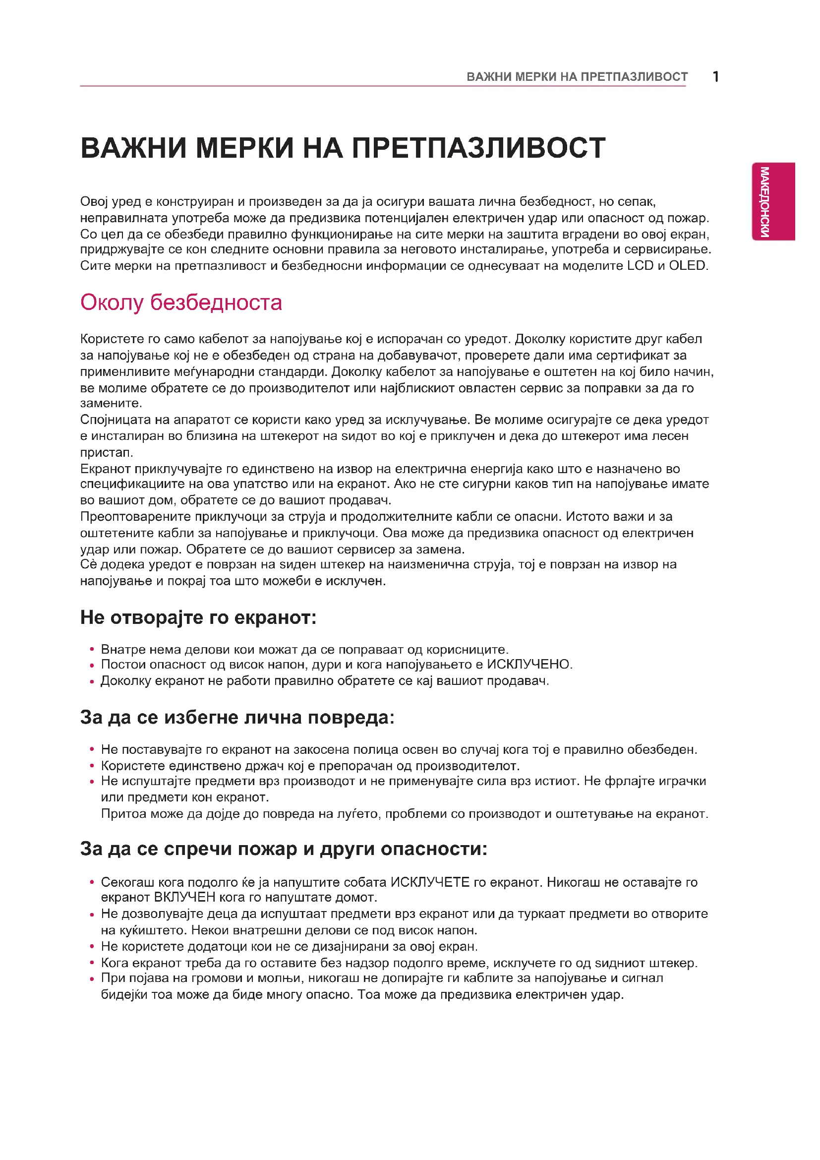 Овој уред е конструиран и произведен за да ја осигури вашата лична безбедност, но сепак, неправилната употреба може да предизвика потенцијален електричен удар или опасност од пожар.Со цел да се обезбеди правилно функционирање на сите мерки на заштита вградени во овој екран, придржувајте се кон следните основни правила за неговото инсталирање, употреба и сервисирање. Сите мерки на претпазливост и безбедносни информации се однесуваат на моделите LCD и OLED. Околу безбедноста Користете го само кабелот за напојување кој е испорачан со уредот. Доколку користите друг кабел за напојување кој не е обезбеден од страна на добавувачот, проверете дали има сертификат за применливите меѓународни стандарди. Доколку кабелот за напојување е оштетен на кој било начин, ве молиме обратете се до производителот или најблискиот овластен сервис за поправки за да го замените.Спојницата на апаратот се користи како уред за исклучување. Ве молиме осигурајте се дека уредот е инсталиран во близина на штекерот на ѕидот во кој е приклучен и дека до штекерот има лесен пристап.Екранот приклучувајте го единствено на извор на електрична енергија како што е назначено во спецификациите на ова упатство или на екранот. Ако не сте сигурни каков тип на напојување имате во вашиот дом, обратете се до вашиот продавач.Преоптоварените приклучоци за струја и продолжителните кабли се опасни. Истото важи и за оштетените кабли за напојување и приклучоци. Ова може да предизвика опасност од електричен удар или пожар. Обратете се до вашиот сервисер за замена.Сè додека уредот е поврзан на ѕиден штекер на наизменична струја, тој е поврзан на извор на напојување и покрај тоа што можеби е исклучен.