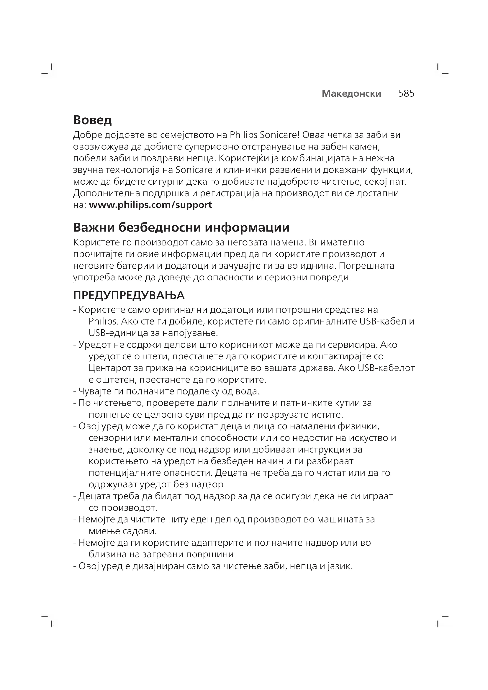 Добре дојдовте во семејството на Philips Sonicare! Оваа четка за заби ви овозможува да добиете супериорно отстранување на забен камен, побели заби и поздрави непца. Користејќи ја комбинацијата на нежна звучна технологија на Sonicare и клинички развиени и докажани функции, може да бидете сигурни дека го добивате најдоброто чистење, секој пат. Дополнителна поддршка и регистрација на производот ви се достапни на: www.philips.com/support Важни безбедносни информации Користете го производот само за неговата намена. Внимателно прочитајте ги овие информации пред да ги користите производот и неговите батерии и додатоци и зачувајте ги за во иднина. Погрешната употреба може да доведе до опасности и сериозни повреди. ПРЕДУПРЕДУВАЊА - Користете само оригинални додатоци или потрошни средства на Philips. Ако сте ги добиле, користете ги само оригиналните USB-кабел и USB-единица за напојување. - Уредот не содржи делови што корисникот може да ги сервисира. Ако уредот се оштети, престанете да го користите и контактирајте со Центарот за грижа на корисниците во вашата држава. Ако USB-кабелот е оштетен, престанете да го користите. - Чувајте ги полначите подалеку од вода. - По чистењето, проверете дали полначите и патничките кутии за полнење се целосно суви пред да ги поврзувате истите. - Овој уред може да го користат деца и лица со намалени физички, сензорни или ментални способности или со недостиг на искуство и знаење, доколку се под надзор или добиваат инструкции за користењето на уредот на безбеден начин и ги разбираат потенцијалните опасности. Децата не треба да го чистат или да го одржуваат уредот без надзор. - Децата треба да бидат под надзор за да се осигури дека не си играат со производот. - Немојте да чистите ниту еден дел од производот во машината за миење садови. - Немојте да ги користите адаптерите и полначите надвор или во близина на загреани површини. - Овој уред е дизајниран само за чистење заби, непца и јазик.586