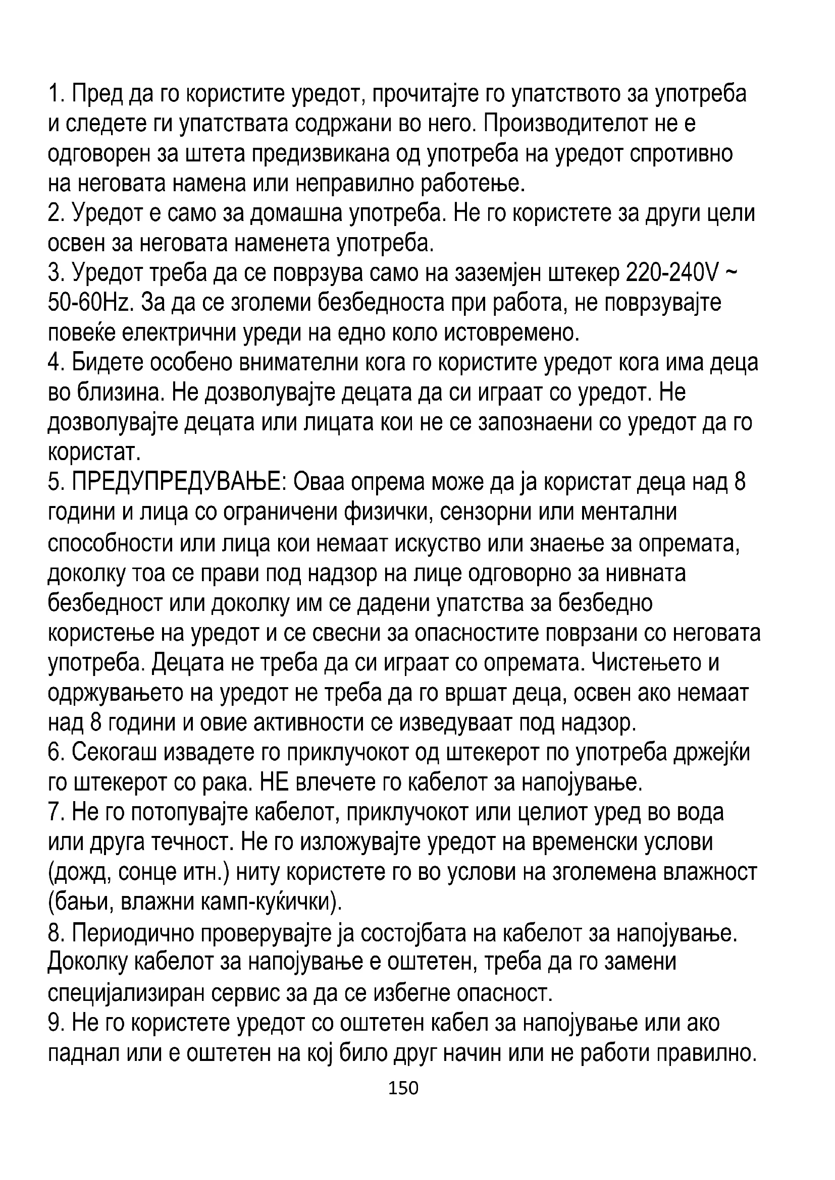 9. Не го користете уредот со оштетен кабел за напојување или ако