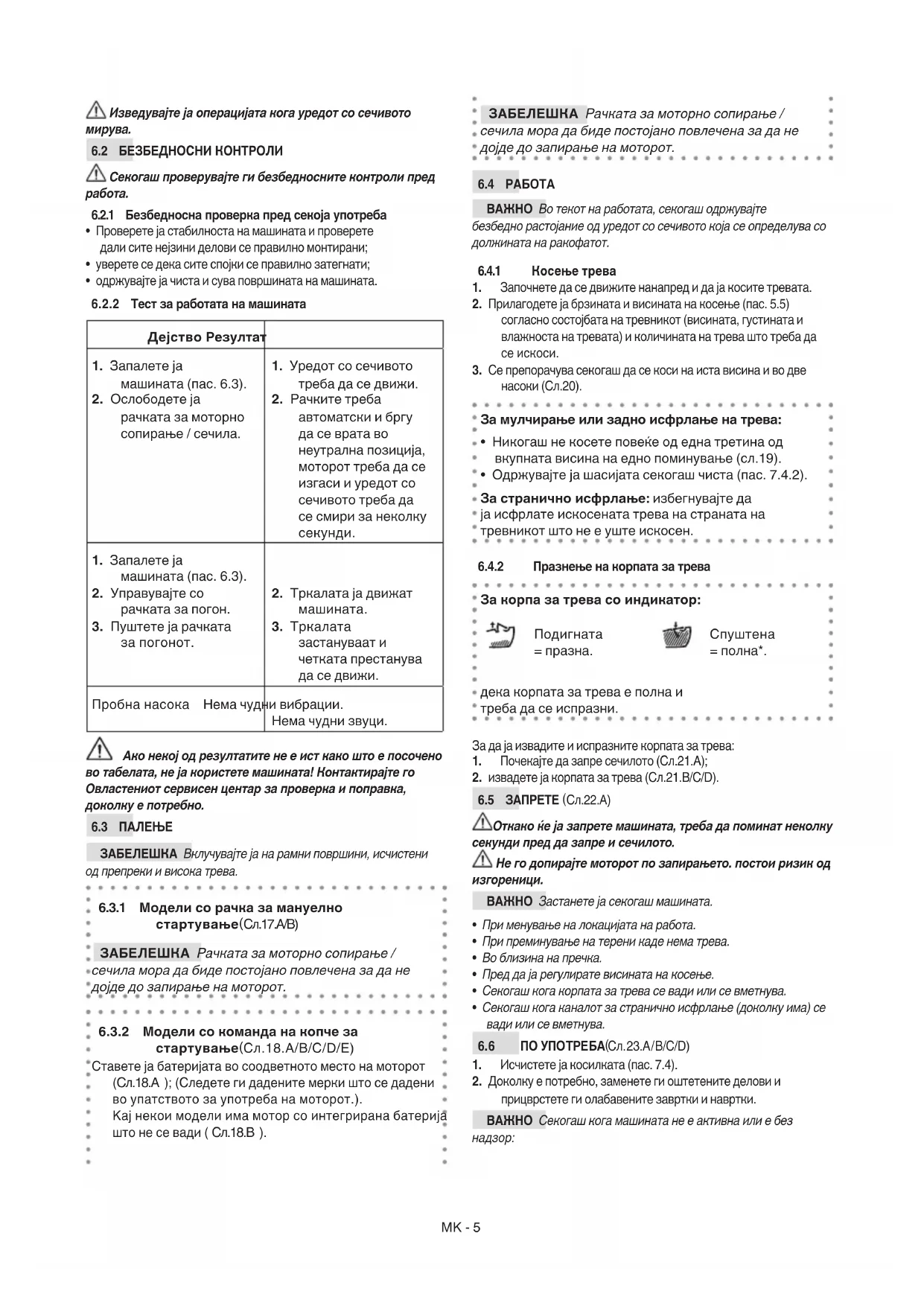 - Да не се допираат деловите на моторот при работа бидејќи се топли, . постои ризик од изгореници. Во случај на дефект или инциденти во текот на работата, веднаш исклучете го моторот и оддалечете ја машината внимавајќи да не предизвикате други оштетувања Во случај на инцидент со лична повреда или повреда на трето лице, пристапете веднаш кон постапката за давање најсоодветна прва помош за дадената состојба и обратете се во соодветен центар за здравствена заштита за неопходно лекување. Отстранете ги темелно сите остатоци од косењето што може да предизвикаат дефект или повреди на лица или животни ако останат незабележано во машината. Ограничување при употреба