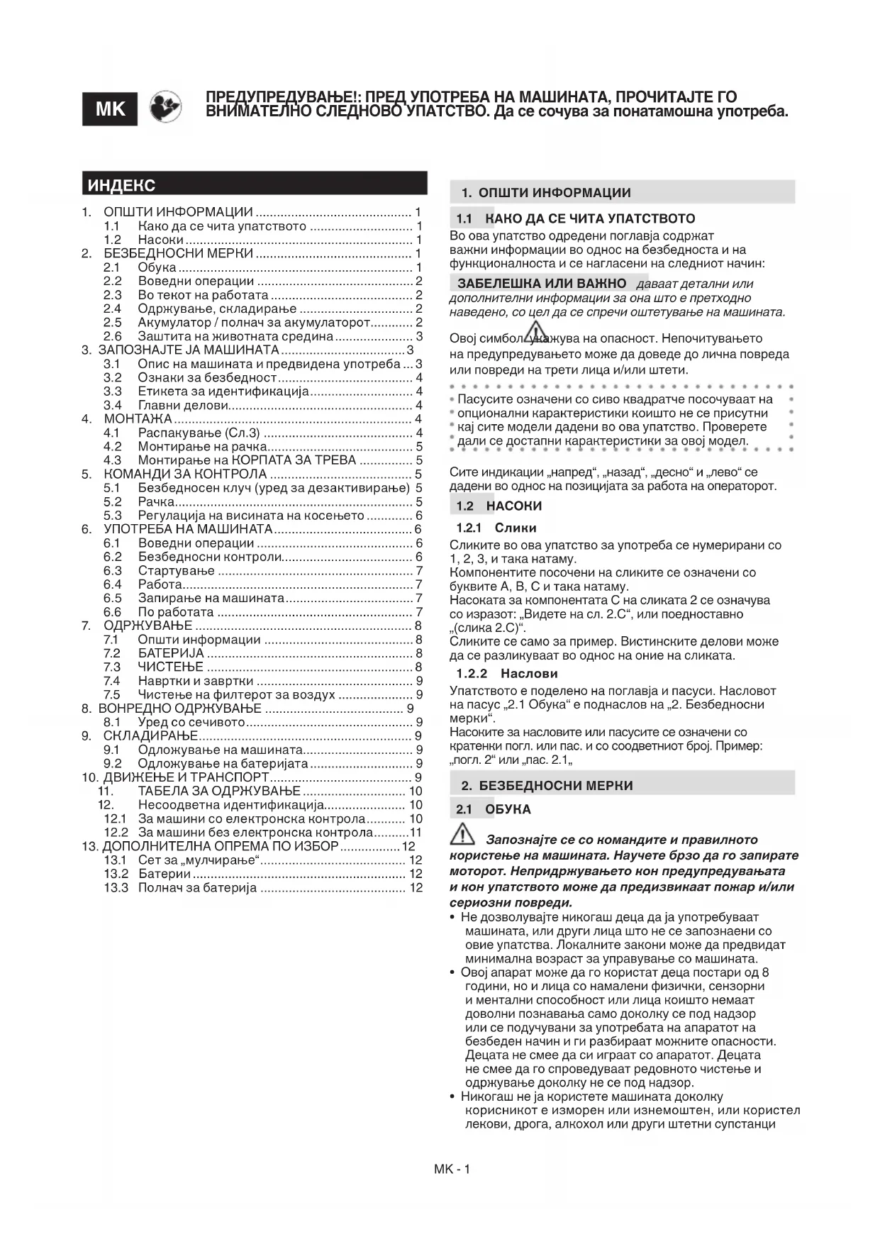 Тревокосачка на батерии со оператор на нозе УПАТСТВА ЗА УПОТРЕБА ВНИМАНИЕ: прочитајте го внимателно ова упатство пред да ја користите машината.