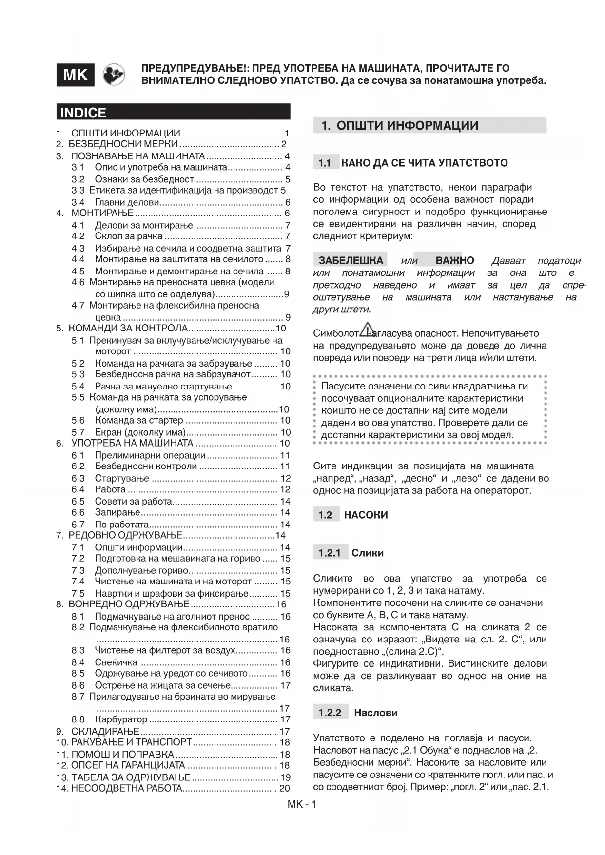 Упатството е поделено на поглавја и пасуси. Насловот на пасус „2.1 Обука“ е поднаслов на „2. Безбедносни мерки“. Насоките за насловите или пасусите се означени со кратенките погл. или пас. и со соодветниот број. Пример: „погл. 2“ или „пас. 2.1. ПРЕДУПРЕДУВАЊЕ!: ПРЕД УПОТРЕБА НА МАШИНАТА, ПРОЧИТАЈТЕ ГО ВНИМАТЕЛНО СЛЕДНОВО УПАТСТВО. Да се сочува за понатамошна употреба.