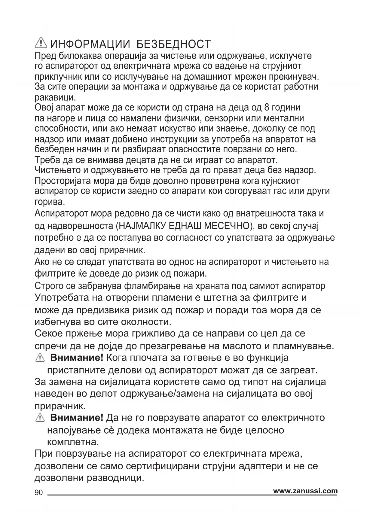 При поврзување на аспираторот со електричната мрежа, дозволени се само сертифицирани струјни адаптери и не се дозволени разводници.91 www.zanussi.com ИНСТРУКЦИИ ЗА БЕЗБЕДНОСТ Што се однесува до техничките и безбедносните мерки за примена за исфрлање на пареа важно е внимателно да се следат правилата дадени од локалните надлежни власти. Издувниот воздух не смее да се предава во активен оџак за чад створен од апарати кои согоруваат гас или други горива. Да не го користите или оставате аспираторот без правилно монтирани сијалици поради можниот ризик од електричен удар. Никогаш не користете го аспираторот ако ја немате правилно монтирано решетката! Аспираторот НИКОГАШ не смее да се користи како површина за поддршка доколку не е прецизно наведено. Користете ги само завртките за прицврстување обезбедени со производот за монтирање или ако не се обезбедени набавете го точниот тип на завртки. Користете ја точната должина за завртките што се наведени во Упатството за монтирање. Во случај на сомневање, консултирајте се со овластениот центар за техничка поддршка или персонал со слични квалификации. ВНИМАНИЕ! Немонтирањето на завртки и уреди за прицврстување во согласност со овие упатства може да доведе до опасности од електрична природа. EКОЛОШКА ПРАШАЊА Рециклирајте ги материјалите со симболот . Ставете ја амбалажата во соодветни контејнери за да ја рециклирате. Помогнете во заштитата на живтната средина и човековото здравје и рециклирајте го отпадот од електрични и електронски апарати. Не фрлајте ги апаратите озанчени со симболот во отпадот од домаќинството. Вратете го производот во вашиот локален капацитет за рециклирање или контактирајте ја вашата општинска канцеларија.
