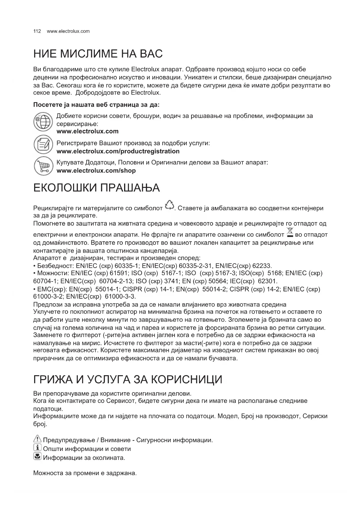 НИЕ МИСЛИМЕ НА ВАС Ви благодариме што сте купиле Electrolux апарат. Одбравте производ којшто носи со себе децении на професионално искуство и иновации. Уникатен и стилски, беше дизајниран специјално за Вас. Секогаш кога ќе го користите, можете да бидете сигурни дека ќе имате добри резултати во секое време. Добродојдовте во Electrolux. Посетете ја нашата веб страница за