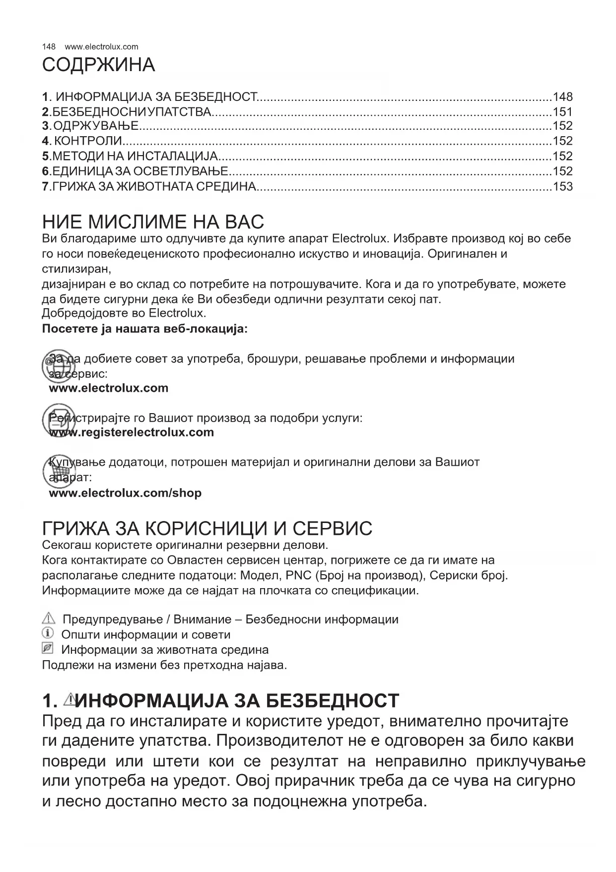- 7.ГРИЖА ЗА ЖИВОТНАТА СРЕДИНА НИЕ МИСЛИМЕ НА ВАС Ви благодариме што одлучивте да купите апарат Electrolux. Избравте производ кој во себе го носи повеќедецениското професионално искуство и иновација. Оригинален и стилизиран, дизајниран е во склад со потребите на потрошувачите. Кога и да го употребувате, можете да бидете сигурни дека ќе Ви обезбеди одлични резултати секој пат. Добредојдовте во Electrolux. Посетете ја нашата веб-локација: За да добиете совет за употреба, брошури, решавање проблеми и информации p. 153