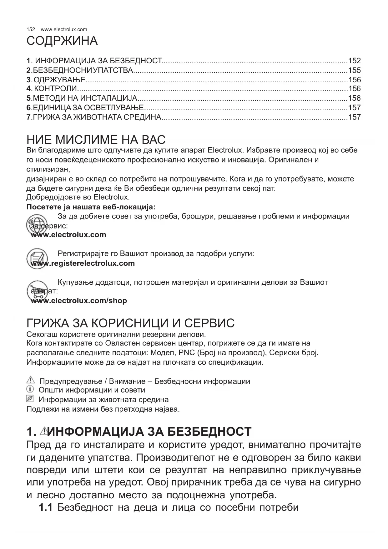 www.electrolux.com/shop ГРИЖА ЗА КОРИСНИЦИ И СЕРВИС Секогаш користете оригинални резервни делови. Кога контактирате со Овластен сервисен центар, погрижете се да ги имате на располагање следните податоци: Модел, PNC (Број на производ), Сериски број. Информациите може да се најдат на плочката со спецификации. Предупредување / Внимание – Безбедносни информации Општи информации и совети Информации за животната средина Подлежи на измени без претходна најава.
