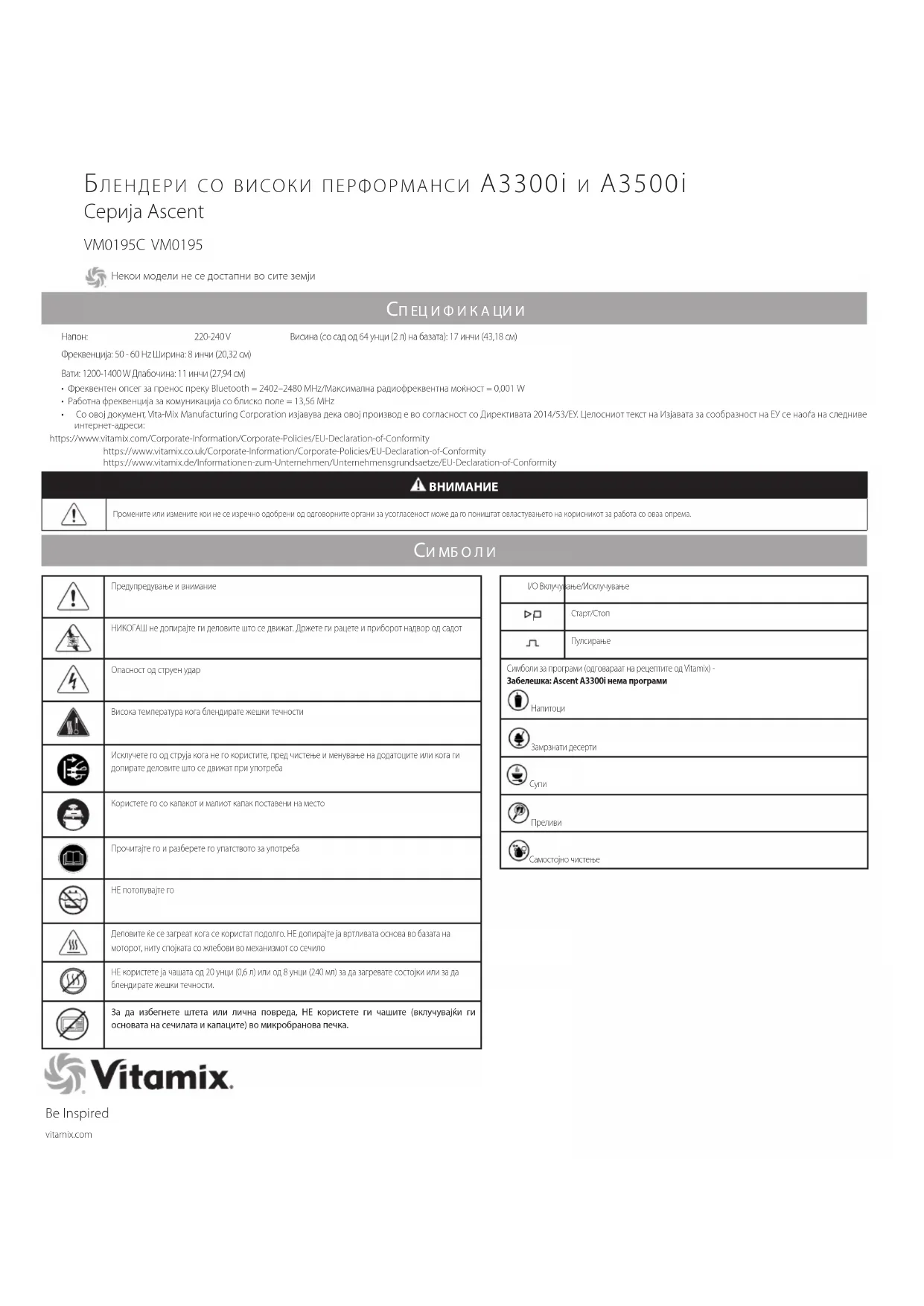 Vitamix ANZ Pty Limited 167 King St Newcastle NSW 2300 Austrálie Tel. č.: 1 800 766437 (AUS) Tel. č.: 050 853 0697 (NZ) www.vitamix.com.au www.vitamix.co.nzблендери со Високи перф о рма н с и A3300i и A3500i Серија Ascent Be Inspiredvitamix.com VM0185 си мб О л и сп ец и ф и к а ци и Напон: 220-240 V Висина (со сад од 64 унци (2 л) на базата): 17 инчи (43,18 см) Фреквенција: 50 - 60 Hz Ширина: 8 инчи (20,32 см)Вати: 1200-1400 W Длабочина: 11 инчи (27,94 см)I/O Вклучување/Исклучување Старт/СтопПулсирањеСимболи за програми (одговараат на рецептите од Vitamix) - Забелешка: Ascent A3300i нема програми Напитоци Замрзнати десерти Супи ПреливиСамостојно чистење VM0195C VM0195 Некои модели не се достапни во сите земји• Фреквентен опсег за пренос преку Bluetooth = 2402–2480 MHz/Максимална радиофреквентна моќност = 0,001 W• Работна фреквенција за комуникација со блиско поле = 13,56 MHz