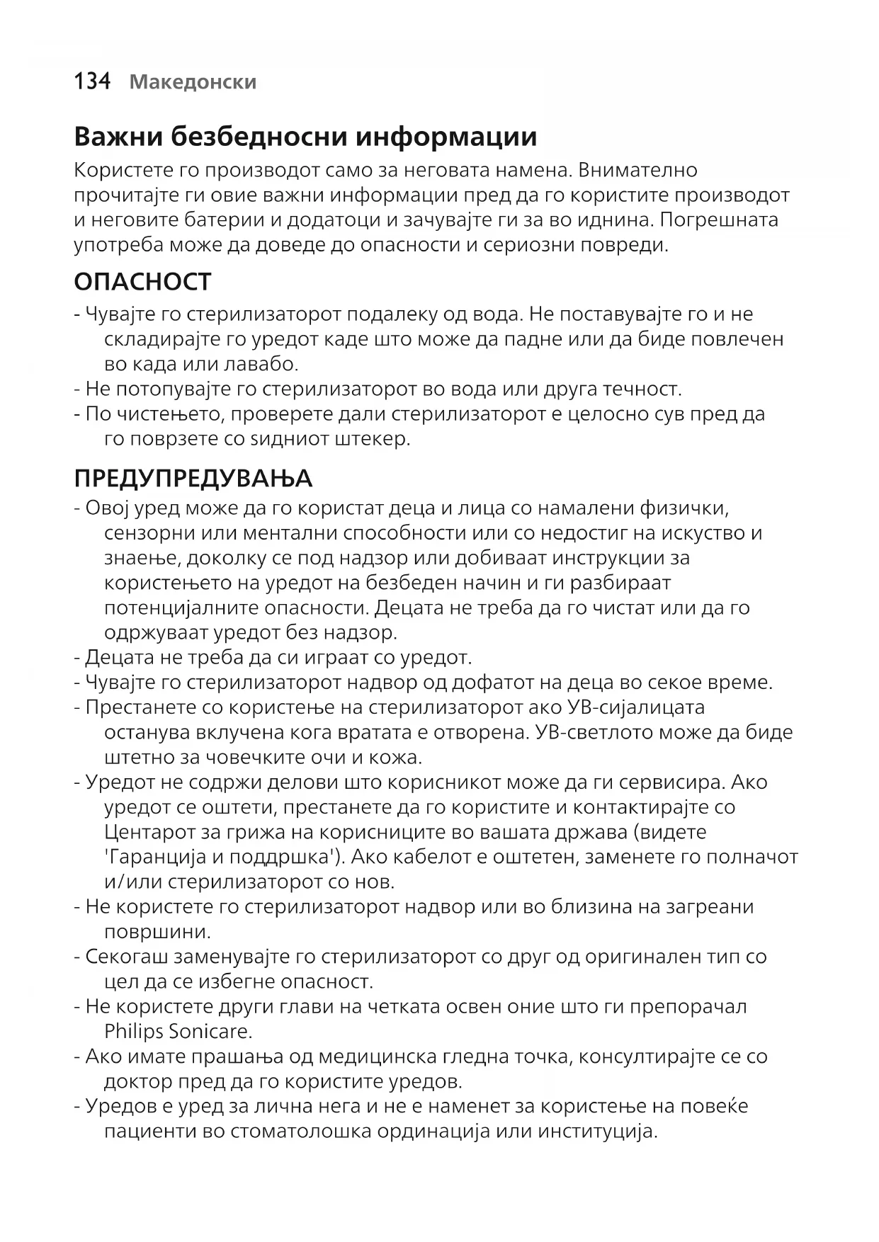 - Секогаш заменувајте го стерилизаторот со друг од оригинален тип со цел да се избегне опасност. - Не користете други глави на четката освен оние што ги препорачал Philips Sonicare. - Ако имате прашања од медицинска гледна точка, консултирајте се со доктор пред да го користите уредов. - Уредов е уред за лична нега и не е наменет за користење на повеќе пациенти во стоматолошка ординација или институција.135