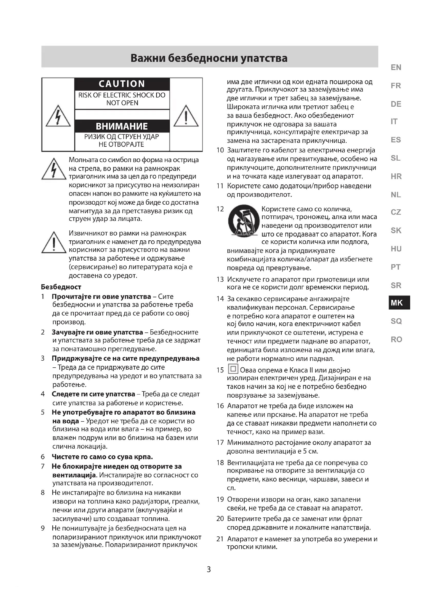 Користете само со количка, потпирач, троножец, алка или маса наведени од производителот или што се продаваат со апаратот. Кога се користи количка или подлога, внимавајте кога ја придвижувате комбинацијата количка/апарат да избегнете повреда од превртување. 13 Исклучете го апаратот при грмотевици или кога не се користи долг временски период. 14 За секакво сервисирање ангажирајте квалификуван персонал. Сервисирање е потребно кога апаратот е оштетен на кој било начин, кога електричниот кабел или приклучокот се оштетени, истурена е течност или предмети паднале во апаратот, единицата била изложена на дожд или влага, не работи нормално или паднал.