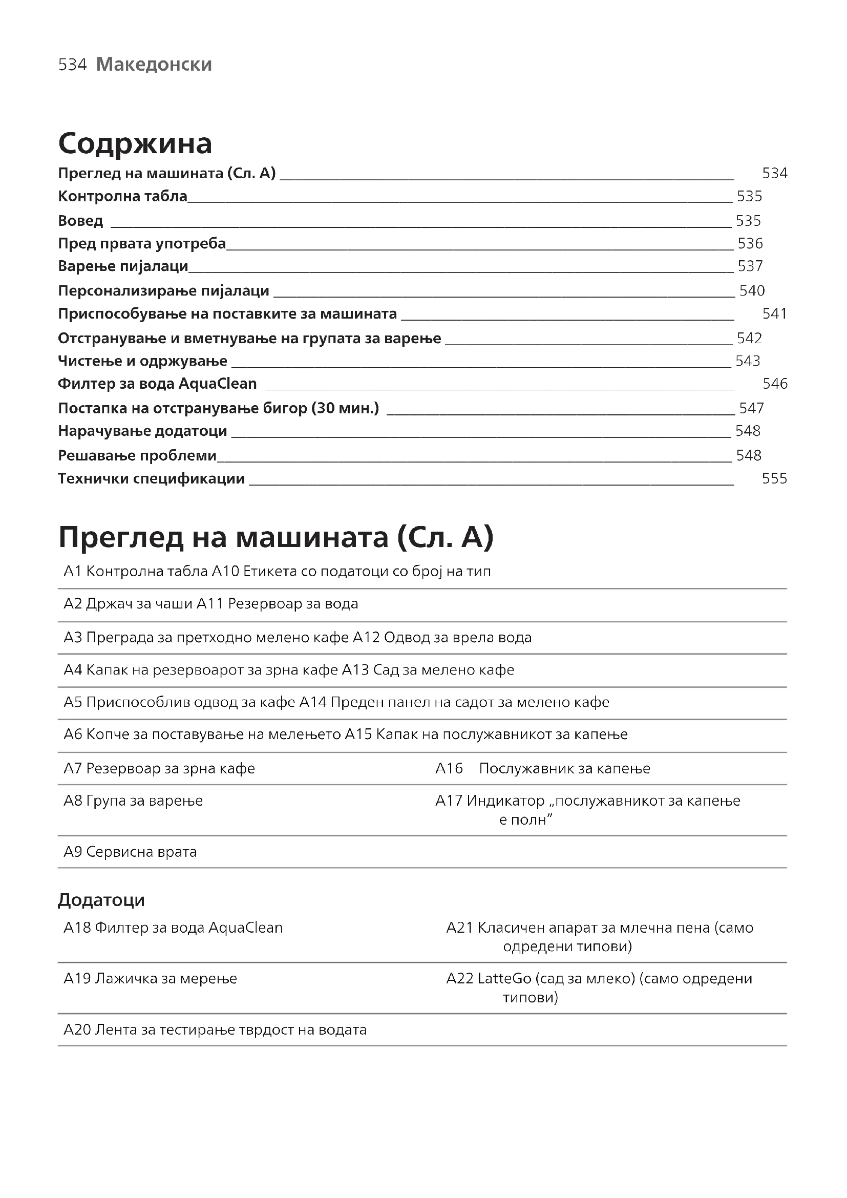 Преглед на машината (Сл. А) ____________________________________________________________ 534 Контролна табла________________________________________________________________________ 535Вовед __________________________________________________________________________________ 535Пред првата употреба___________________________________________________________________ 536Варење пијалаци________________________________________________________________________ 537Персонализирање пијалаци _____________________________________________________________ 540 Приспособување на поставките за машината ____________________________________________ 541 Отстранување и вметнување на групата за варење ______________________________________ 542Чистење и одржување __________________________________________________________________ 543 Филтер за вода AquaClean ______________________________________________________________ 546 Постапка на отстранување бигор (30 мин.) ______________________________________________ 547Нарачување додатоци __________________________________________________________________ 548Решавање проблеми____________________________________________________________________ 548 Технички спецификации ________________________________________________________________ 555 Преглед на машината (Сл. А) A1 Контролна табла A10 Етикета со податоци со број на типA2 Држач за чаши A11 Резервоар за водаA3 Преграда за претходно мелено кафе A12 Одвод за врела водаA4 Капак на резервоарот за зрна кафе A13 Сад за мелено кафеA5 Приспособлив одвод за кафе A14 Преден панел на садот за мелено кафеA6 Копче за поставување на мелењето A15 Капак на послужавникот за капењеA7 Резервоар за зрна кафе A16 Послужавник за капењеA8 Група за варење A17 Индикатор „послужавникот за капењее полн“A9 Сервисна врата A18 Филтер за вода AquaClean A21 Класичен апарат за млечна пена (самоодредени типови)A19 Лажичка за мерење A22 LatteGo (сад за млеко) (само одреденитипови)A20 Лента за тестирање тврдост на водата535