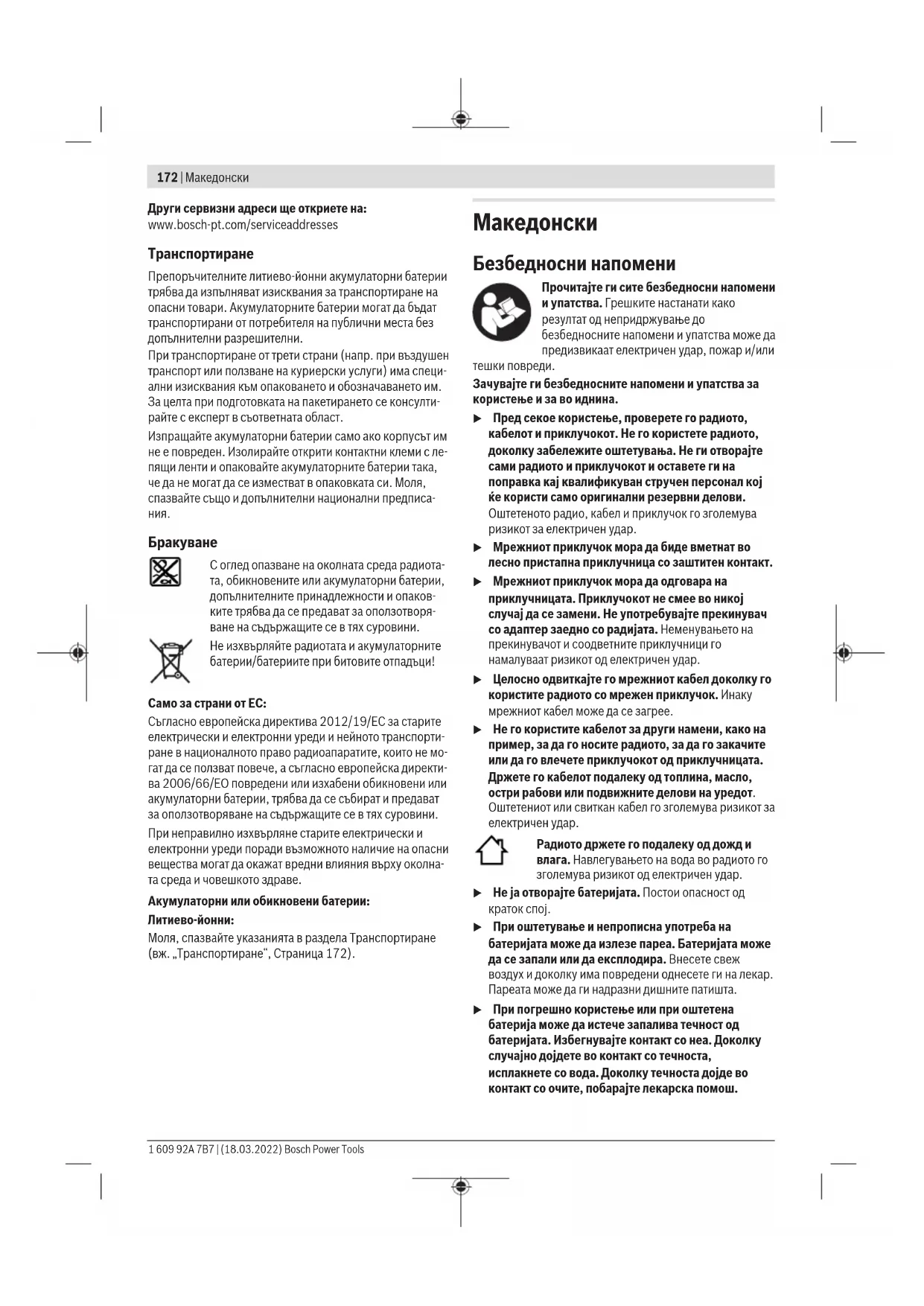 Препорачаните литиум-јонски батерии подлежат на барањата на Законот за опасни материјали. Батериите може да се транспортираат само од страна на корисникот, без потреба од дополнителни квалификации. При пренос на истите од страна на трети лица (на пр. воздушен транспорт или шпедиција) неопходно е да се внимава на специјалните напомени на амбалажата и ознаките. Во таков случај, при подготовката на пратката мора да се повика експерт за опасни супстанци. Транспортирајте ги батериите само доколку куќиштето е неоштетено. Залепете ги отворените контакти и спакувајте ја батеријата на тој начин што нема да се движи во амбалажата. Ве молиме внимавајте на евентуалните дополнителни национални прописи. Отстранување Радијата, акумулаторските батерии/ батериите, опремата и амбалажите треба да се отстранат на еколошки прифатлив начин. Не ги фрлајте радијата и акумулаторските батерии/батериите во домашната канта за