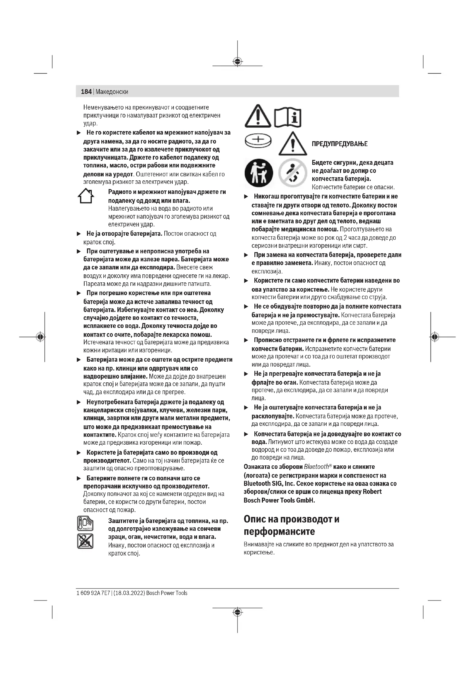 u Не ја оштетувајте копчестата батерија и не ја расклопувајте. Копчестата батерија може да протече, да експлодира, да се запали и да повреди лица. u Копчестата батерија не ја доведувајте во контакт со вода. Литиумот што истекува може со вода да создаде водород и со тоа да доведе до пожар, експлозија или до повреди на лица. Ознаката со зборови Bluetooth® како и сликите (логоата) се регистрирани марки и сопственост на Bluetooth SIG, Inc. Секое користење на оваа ознака со зборови/слики се врши со лиценца преку Robert Bosch Power Tools GmbH. Опис на производот и перформансите Внимавајте на сликите во предниот дел на упатството за