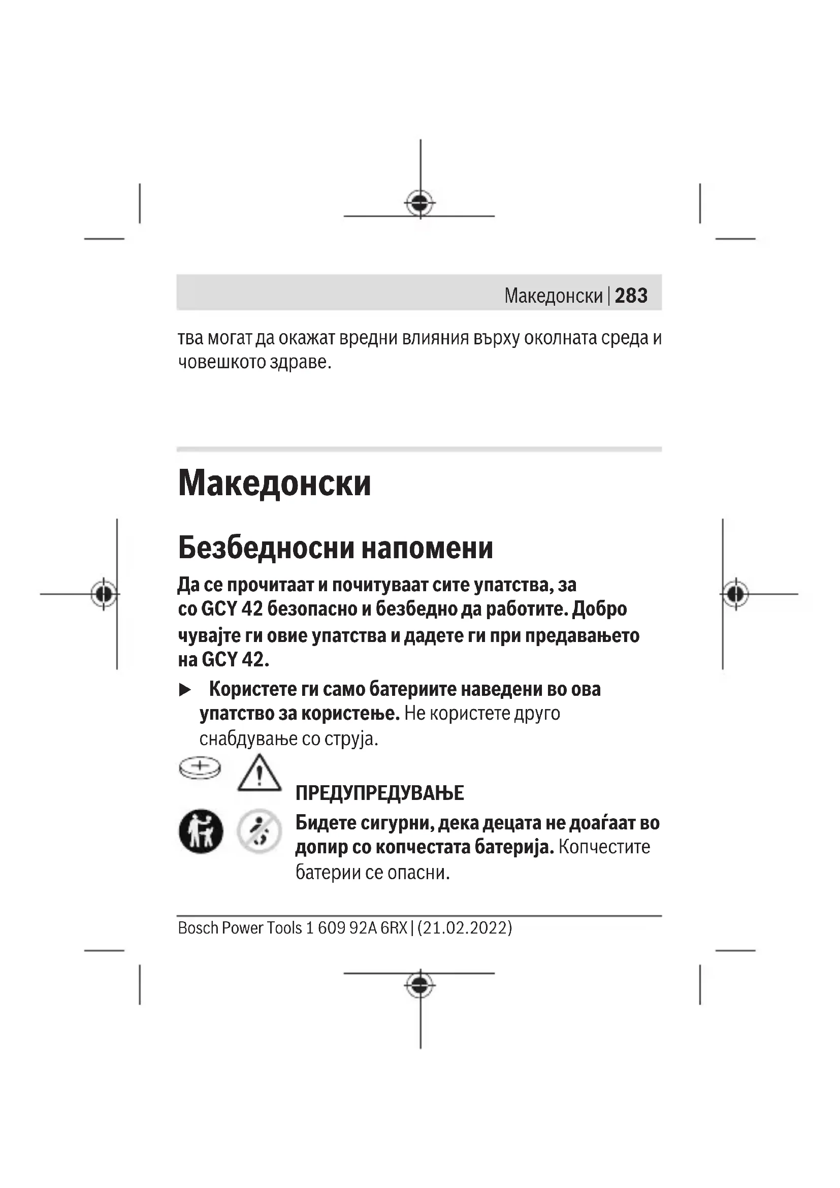 Безбедносни напомени Да се прочитаат и почитуваат сите упатства, за соGCY42 безопасно и безбедно да работите. Добро чувајте ги овие упатства и дадете ги при предавањето наGCY42. u Користете ги само батериите наведени во ова упатство за користење. Не користете друго снабдување со струја. ПРЕДУПРЕДУВАЊЕ Бидете сигурни, дека децата не доаѓаат во допир со копчестата батерија. Копчестите батерии се опасни. Bosch Power Tools 1 609 92A 6RX | (21.02.2022)284 | Македонски u Никогаш проголтувајте ги копчестите батерии и не ставајте ги други отвори од телото. Доколку постои сомневање дека копчестата батерија е проголтана или е вметната во друг дел од телото, веднаш побарајте медицинска помош. Проголтувањето на копчеста батерија може во рок од 2часа да доведе до сериозни внатрешни изгореници или смрт. u При замена на копчестата батерија, проверете дали е правилно заменета. Инаку, постои опасност од експлозија. u Користете ги само копчестите батерии наведени во ова упатство за користење. Не користете други копчести батерии или друго снабдување со струја. u Не се обидувајте повторно да ја полните копчестата батерија и не ја премостувајте. Копчестата батерија може да протече, да експлодира, да се запали и да повреди лица. u Прописно отстранете ги и фрлете ги испразнетите копчести батерии. Испразнетите копчести батерии може да протечат и со тоа да го оштетат производот или да повредат лица. 1 609 92A 6RX | (21.02.2022) Bosch Power ToolsМакедонски | 285 u Не ја прегревајте копчестата батерија и не ја фрлајте во оган. Копчестата батерија може да протече, да експлодира, да се запали и да повреди лица. u Не ја оштетувајте копчестата батерија и не ја расклопувајте. Копчестата батерија може да протече, да експлодира, да се запали и да повреди лица. u Копчестата батерија не ја доведувајте во контакт со вода. Литиумот што истекува може со вода да создаде водород и со тоа да доведе до пожар, експлозија или до повреди на лица. Ознаката со зборови Bluetooth® како и сликите (логоата) се регистрирани марки и сопственост на Bluetooth SIG, Inc. Секое користење на оваа ознака со зборови/слики се врши со лиценца преку Robert Bosch Power Tools GmbH. u Не го користете веќе Bluetooth®-модулот, ако капакот не може да се затвори, извадете ја копчестата батерија и поправете го. Bosch Power Tools 1 609 92A 6RX | (21.02.2022)286 | Македонски Опис на производот и перформансите Наменета употреба Bluetooth® Low Energy ModuleGCY42 овозможува персонализирање и статусна проверка на еден електричен алат, како и пренесување на поставките и податоците врз основа на Bluetooth®-безжичната технологија. Преносот на податоци мора да се одобри од страна на корисниците. Информациите за понудените Connectivity-функции ги добивате во апликацијата (App) Bosch Toolbox или во упатството за користење на електричниот алат што се употребува. Илустрација на компоненти Нумерирањето на илустрираните компоненти се однесува на приказот на графичките страници. (1) Копчеста батерија (2) Bluetooth® Low Energy Module GCY 42 (3)