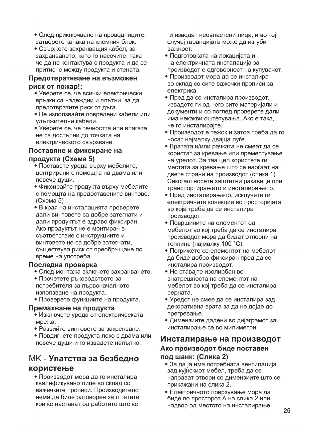 - Производот мора да се инсталира така што ќе може потполно да се исклучи од електричната мрежа. Сепарирањето мора да се направи со специјален прекинувач вграден во фиксната електрична инсталација, во согласност со градежните прописи.