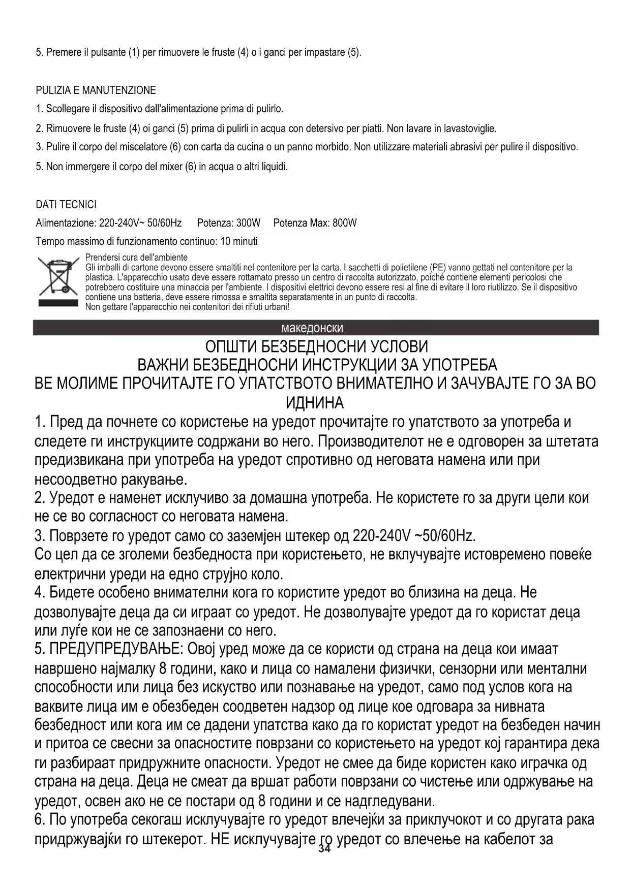 ТЕХНИЧКИ ПОДАТОЦИ Напојување: 220-240V ~ 50 / 60Hz Моќност: 300W Моќ Макс: 800W Максимално време на континуирано работење: 10 минути Се грижиме за природната средина. Картонските паковки молиме да се наменат за рециклирање. Полиетиленовите кеси (PE) да се фрлат во контењер за пластика. Искористениот уред треба да се предаде во соодветниот складирачки пункт, бидејќи небезбедните состојки кои се наоѓаат во уредот можат да бидат загрозување за средината. Електричниот уред треба да се предаде на начин кој ќе оневозможи негова повторна употреба и искористување. Доколку во уредот има батерии, треба да се извадат и посебно да се предадат во складирачкиот пункт. NEDERLANDS ALGEMENE VEILIGHEIDSINSTRUCTIES