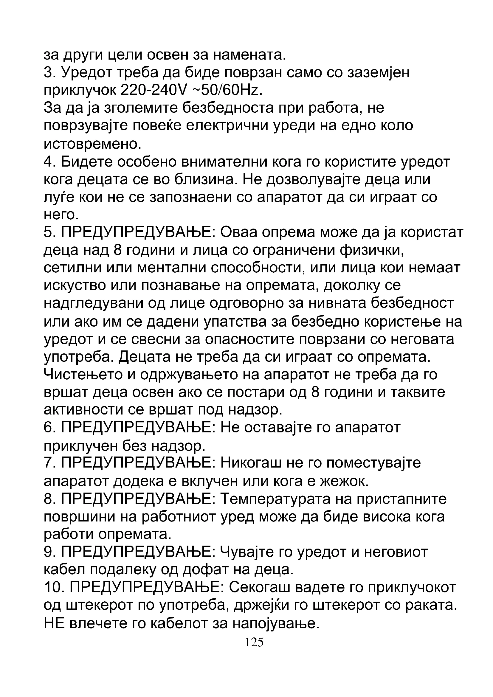 приклучок 220-240V ~50/60Hz. За да ја зголемите безбедноста при работа, не поврзувајте повеќе електрични уреди на едно коло истовремено.