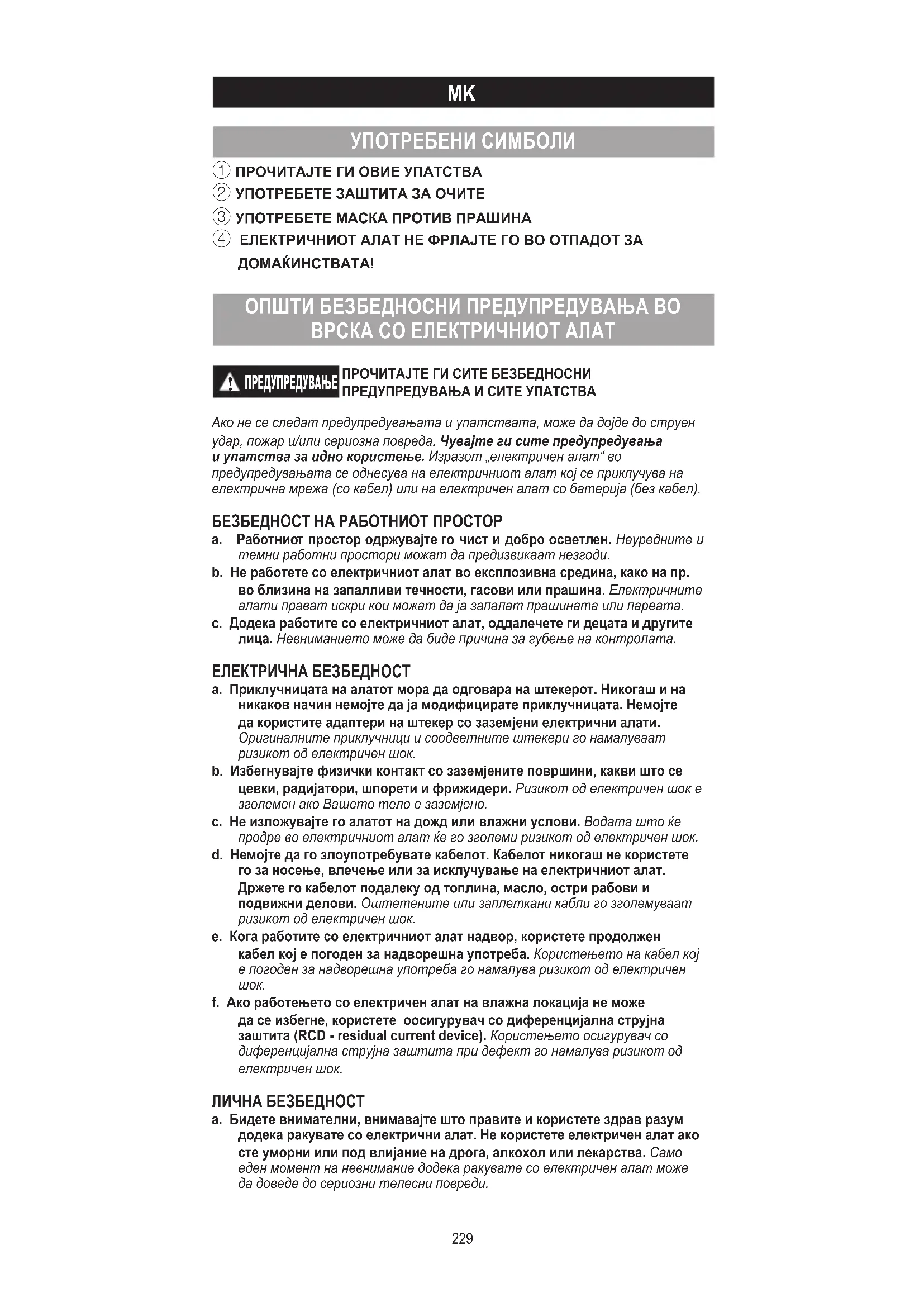 ПРЕДУПРЕДУВАЊЕ ПРОЧИТАЈТЕ ГИ СИТЕ БЕЗБЕДНОСНИ ПРЕДУПРЕДУВАЊА И СИТЕ УПАТСТВААко не се следат предупредувањата и упатствата, може да дојде до струен удар, пожар и/или сериозна повреда. Чувајте ги сите предупредувања и упатства за идно користење. Изразот „електричен алат“ во предупредувањата се однесува на електричниот алат кој се приклучува на електрична мрежа (со кабел) или на електричен алат со батерија (без кабел). БЕЗБЕДНОСТ НА РАБОТНИОТ ПРОСТОР a. Работниот простор одржувајте го чист и добро осветлен. Неуредните и темни работни простори можат да предизвикаат незгоди.b. Не работете со електричниот алат во експлозивна средина, како на пр. во близина на запалливи течности, гасови или прашина. Електричните алати прават искри кои можат да ја запалат прашината или пареата.c. Додека работите со електричниот алат, оддалечете ги децата и другите лица. Невниманието може да биде причина за губење на контролата. ЕЛЕКТРИЧНА БЕЗБЕДНОСТ a. Приклучницата на алатот мора да одговара на штекерот. Никогаш и на никаков начин немојте да ја модифицирате приклучницата. Немојте да користите адаптери на штекер со заземjени електрични алати. Оригиналните приклучници и соодветните штекери го намалуваат ризикот од електричен шок.b. Избегнувајте физички контакт со заземјените површини, какви што се цевки, радијатори, шпорети и фрижидери. Ризикот од електричен шок е зголемен ако Вашето тело е заземјено.c. Не изложувајте го алатот на дожд или влажни услови. Водата што ќе продре во електричниот алат ќе го зголеми ризикот од електричен шок.d. Немојте да го злоупотребувате кабелот. Кабелот никогаш не користете го за носење, влечење или за исклучување на електричниот алат. Држете го кабелот подалеку од топлина, масло, остри рабови и подвижни делови. Оштетените или заплеткани кабли го зголемуваат ризикот од електричен шок.e. Кога работите со електричниот алат надвор, користете продолжен кабел кој е погоден за надворешна употреба. Користењето на кабел кој е погоден за надворешна употреба го намалува ризикот од електричен f. Ако работењето со електричен алат на влажна локација не може да се избегне, користете oосигурувач со диференцијална струјна заштита (RCD - residual current device). Користењето осигурувач со диференцијална струјна заштита при дефект го намалува ризикот од електричен шок. ЛИЧНА БЕЗБЕДНОСТ a. Бидете внимателни, внимавајте што правите и користете здрав разум додека ракувате со електрични алат. Не користете електричен алат ако сте уморни или под влијание на дрога, алкохол или лекарства. Само еден момент на невнимание додека ракувате со електричен алат може да доведе до сериозни телесни повреди.230 b. Користете опрема за лична заштита. Секогаш носете заштита за очите. Заштитната опрема, како на пр. маска против прашина, нелизгачки заштитни чевли, заштитен шлем или заштита за ушите, која се користи во соодветни услови, ќе ја намали можноста од повреди на