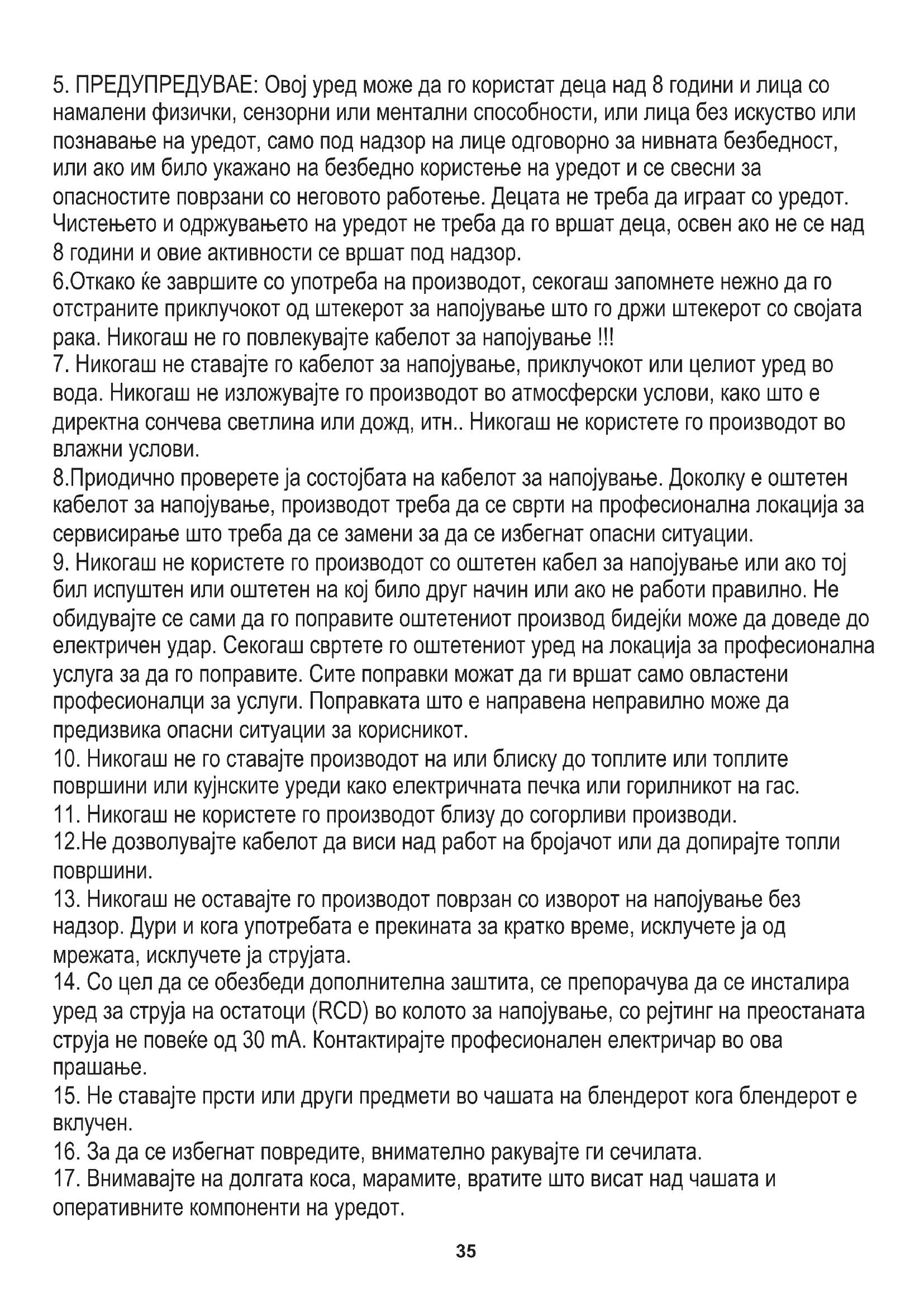 21. Не ставајте други производи освен храна и течности во чашата за блендер. Не