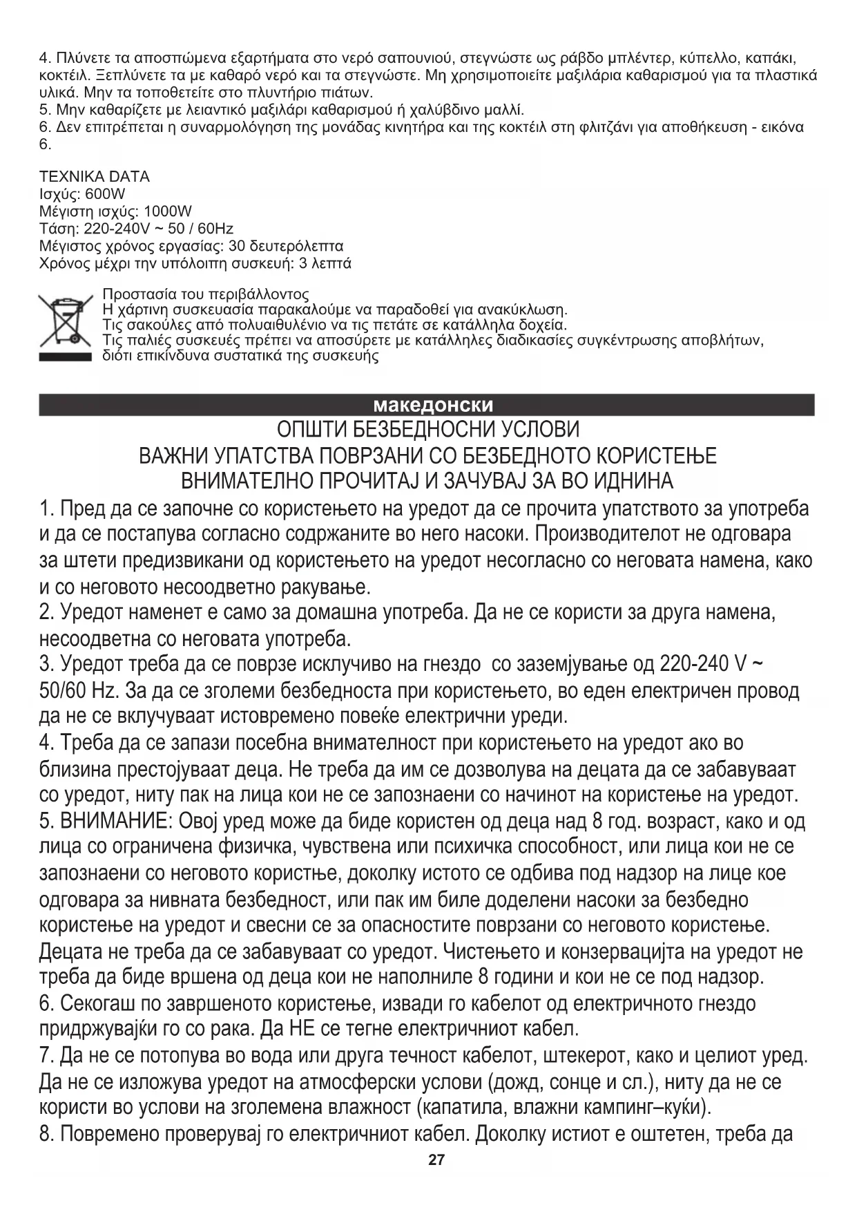 Рачниот мешач е погоден за подготовка на супи, сосови, бебешки оброци, како и коктели. Апаратот не е наменет за мешање на мраз и храна за месо. Моќност: 600W Моќност: 1000W ТЕХНИЧКИ ПОДАТОЦИ Напон: 220-240V ~ 50 / 60Hz Макс. Време на работа: 30 секунди