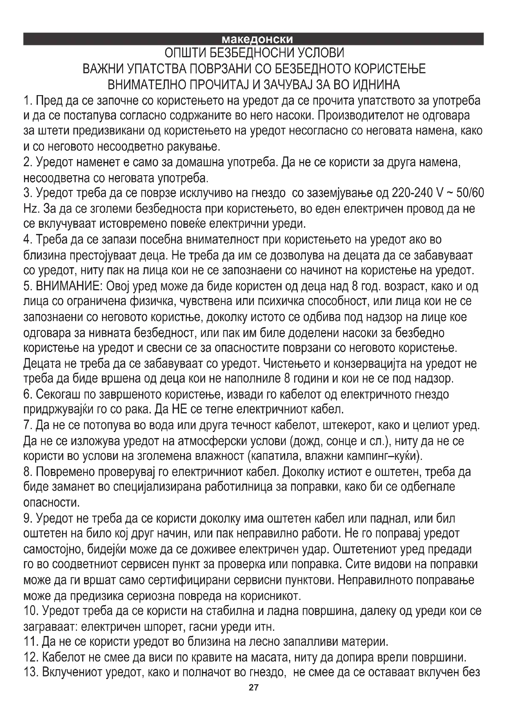 и да се постапува согласно содржаните во него насоки. Производителот не одговара за штети предизвикани од користењето на уредот несогласно со неговата намена, како и со неговото несоодветно ракување. ОПШТИ БЕЗБЕДНОСНИ УСЛОВИ ВАЖНИ УПАТСТВА ПОВРЗАНИ СО БЕЗБЕДНОТО КОРИСТЕЊЕ ВНИМАТЕЛНО ПРОЧИТАЈ И ЗАЧУВАЈ ЗА ВО ИДНИНА