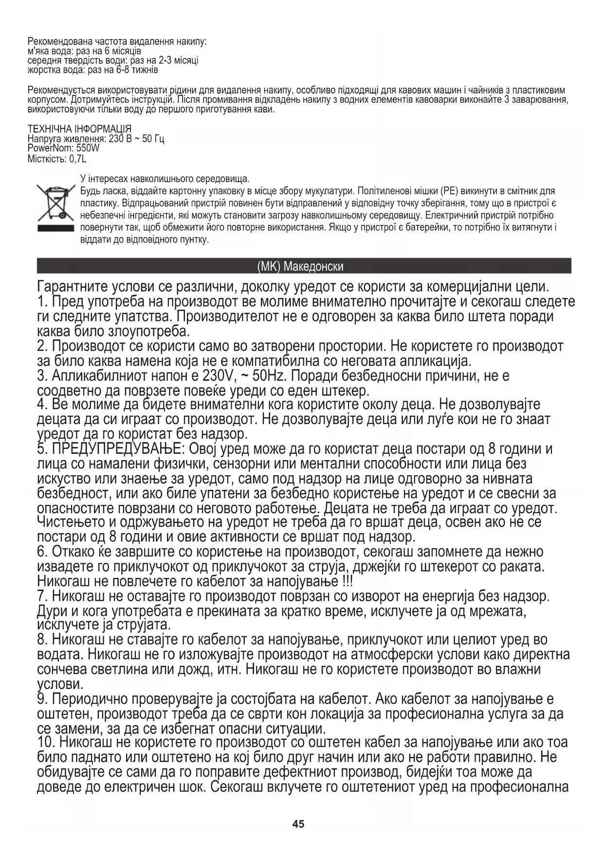 5.Елементи на машината за кафе не треба да се мијат во машина за миење садови. Декализирање: За да се осигура дека машината за кафе функционира сигурно и да биде целосно ефективна, треба редовно да се декласира. Фреквенцијата на деминирање зависи од тврдоста на водата и од фреквенцијата на употреба. Депонирачкиот бигол води до подолго подготвување на кафе и може да доведе до оштетување на машината за кафе. Препорачана фреквенција на деминирање: мека вода: еднаш на секои 6 месеци средна тврдост на вода: еднаш на секои 2-3 месеци тврда вода: еднаш на секои 6-8 недели Препорачуваме употреба на течности за чистење, особено погодни за машини за кафе и котли со пластично куќиште. Следете ги дадените упатства. По испирање на наслагите од вода од елементите за вода на машината за кафе, изведувајте 3 пијалаци користејќи само вода пред првото пиење на кафе. ТЕХНИЧКА ИНФОРМАЦИЈА Напојување: 230V ~ 50Hz PowerNom: 550W Капацитет: 0,7L Се грижиме за природната средина. Картонските паковки молиме да се наменат за рециклирање. Полиетиленовите кеси (PE) да се фрлат во контењер за пластика. Искористениот уред треба да се предаде во соодветниот складирачки пункт, бидејќи небезбедните состојки кои се наоѓаат во уредот можат да бидат загрозување за средината. Електричниот уред треба да се предаде на начин кој ќе оневозможи негова повторна употреба и искористување. Доколку во уредот има батерии, треба да се извадат и посебно да се предадат во складирачкиот пункт.47 (SK) SLOVENSKÝ Záručné podmienky sa líšia, ak sa zariadenie používa na komerčné účely.