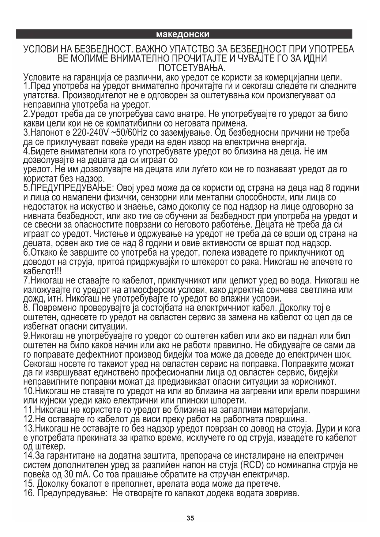 14.За гарантитане на додатна заштита, препорача се инсталиране на електричен систем дополнителен уред за разлиѝен напон на стуја (RCD) со номинална струја не повеќа од 30 mA. Со тоа прашање обратите на стручан електричар. 2.Уредот треба да се употребува само внатре. Не употребувајте го уредот за било какви цели кои не се компатибилни со неговата примена. 10.Никогаш не ставајте го уредот на или во близина на загреани или врели површини или кујнски уреди како електрични или плински шпорети. ВЕ МОЛИМЕ ВНИМАТЕЛНО ПРОЧИТАЈТЕ И ЧУВАЈТЕ ГО ЗА ИДНИ ПОТСЕТУВАЊА.