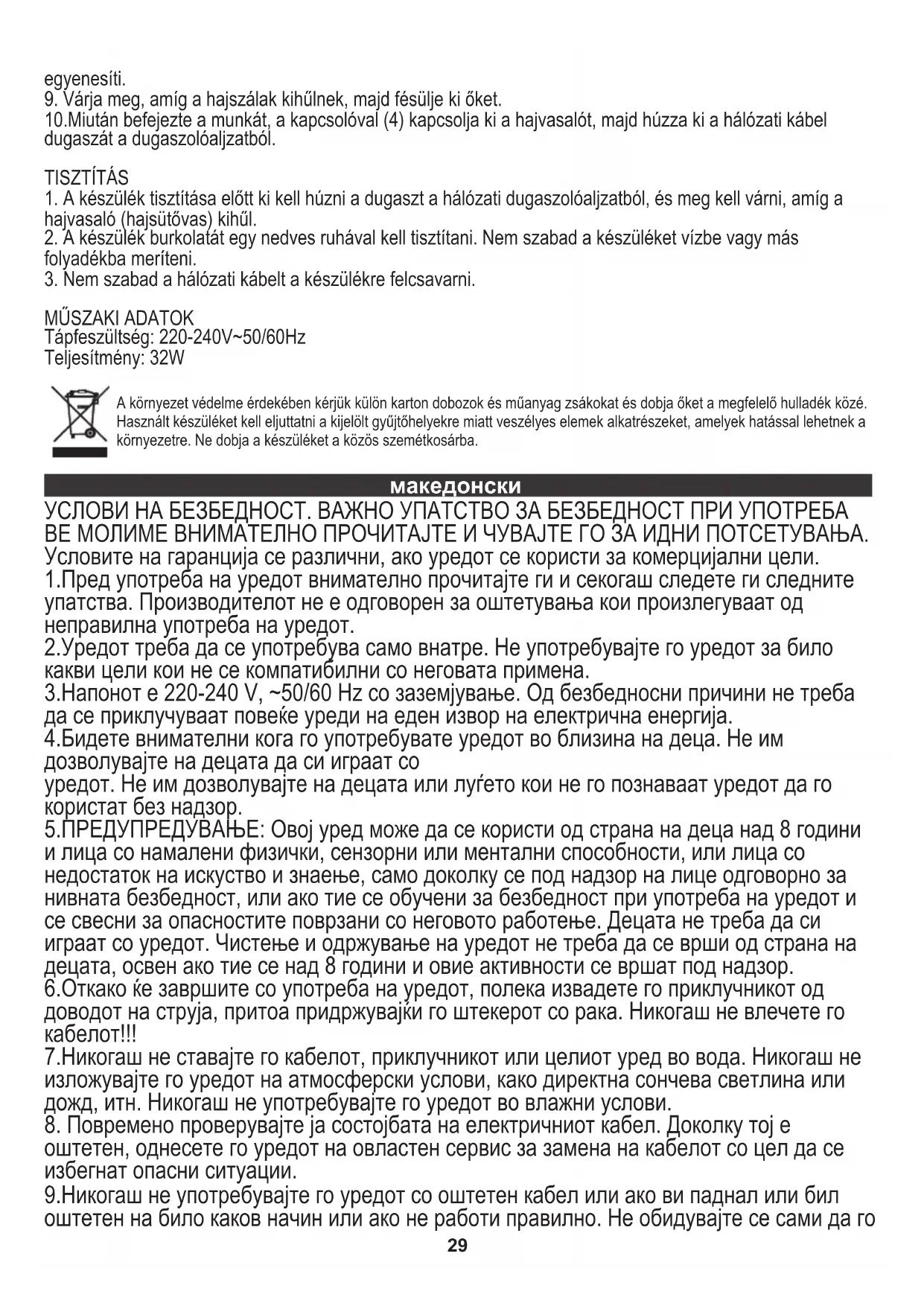 оштетен, однесете го уредот на овластен сервис за замена на кабелот со цел да се избегнат опасни ситуации. ВЕ МОЛИМЕ ВНИМАТЕЛНО ПРОЧИТАЈТЕ И ЧУВАЈТЕ ГО ЗА ИДНИ ПОТСЕТУВАЊА. 2.Уредот треба да се употребува само внатре. Не употребувајте го уредот за било какви цели кои не се компатибилни со неговата примена. 3.Напонот е 220-240 V, ~50/60 Hz со заземјување. Од безбедносни причини не треба да се приклучуваат повеќе уреди на еден извор на електрична енергија. 4.Бидете внимателни кога го употребувате уредот во близина на деца. Не им дозволувајте на децата да си играат со 9.Никогаш не употребувајте го уредот со оштетен кабел или ако ви паднал или бил оштетен на било каков начин или ако не работи правилно. Не обидувајте се сами да го A környezet védelme érdekében kérjük külön karton dobozok és műanyag zsákokat és dobja őket a megfelelő hulladék közé. Használt készüléket kell eljuttatni a kijelölt gyűjtőhelyekre miatt veszélyes elemek alkatrészeket, amelyek hatással lehetnek a környezetre. Ne dobja a készüléket a közös szemétkosárba.30