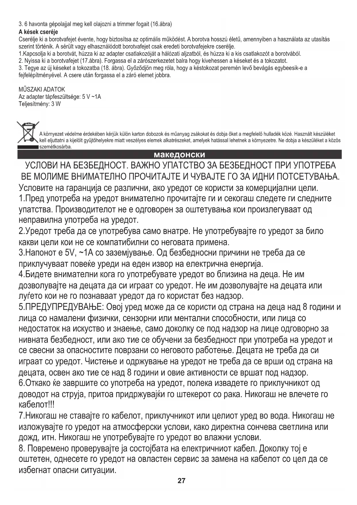 14.За гарантитане на додатна заштита, препорача се инсталиране на електричен систем дополнителен уред за разлиѝен напон на стуја (RCD) со номинална струја не повеќа од 30 mA. Со тоа прашање обратите на стручан електричар. 15.Кога уредот е користен во капатило, по користењето да се исклучи од струја, бидејќи близината на вода претставува опасност дури и тогаш, кога уредот е