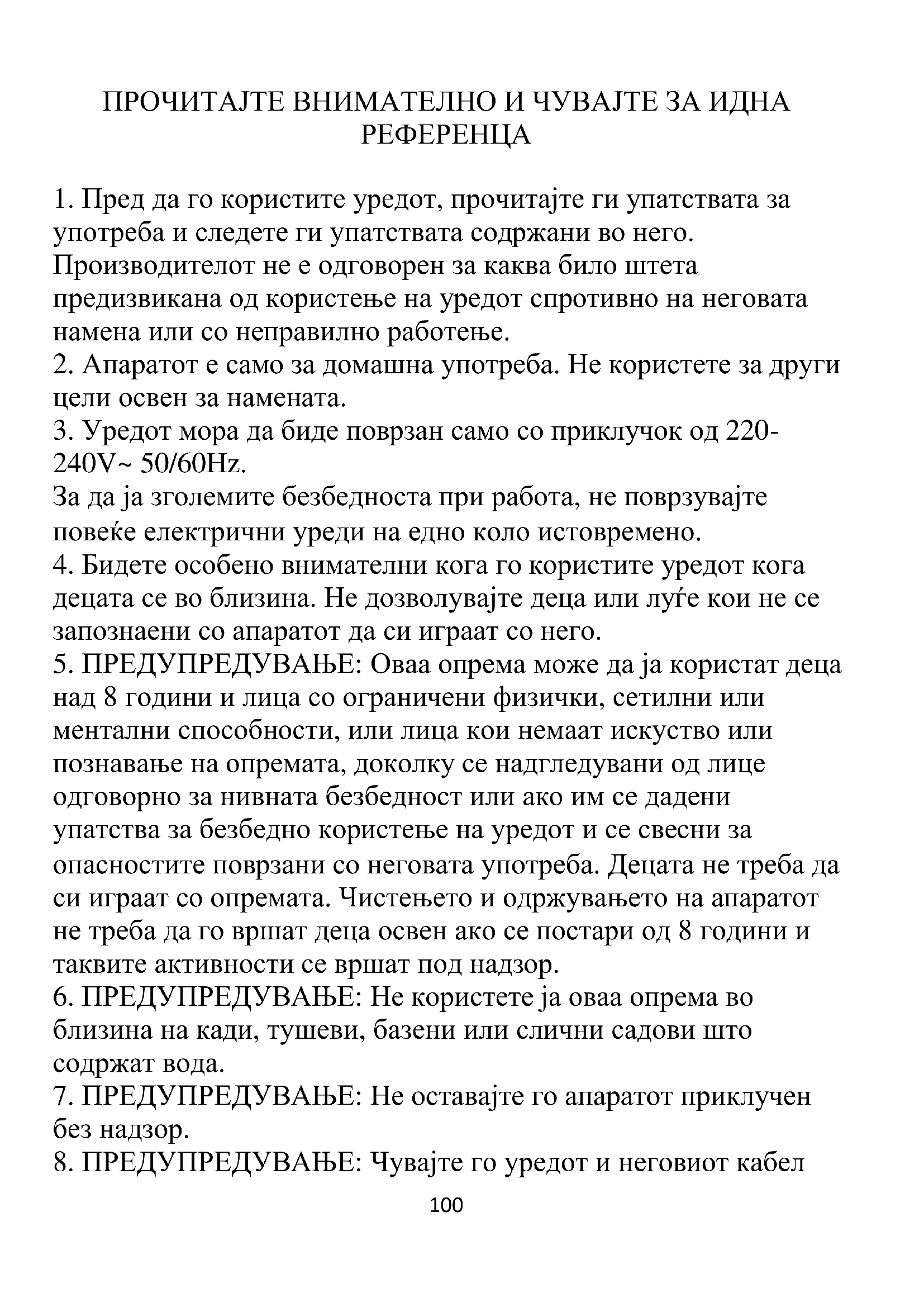 8. ПРЕДУПРЕДУВАЊЕ: Чувајте го уредот и неговиот кабел101