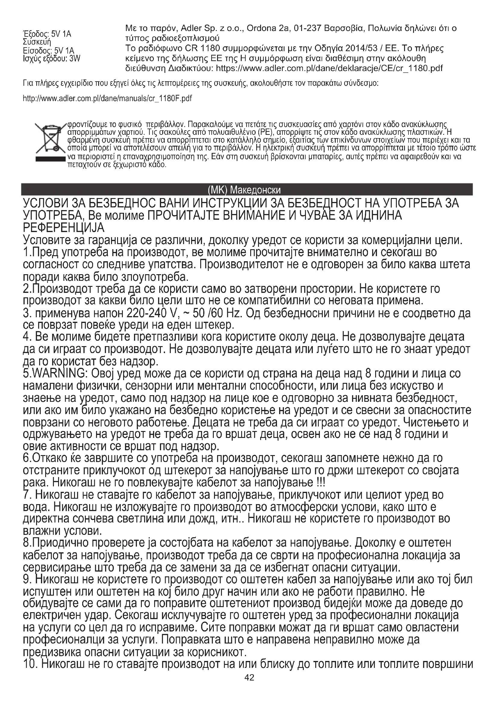 Можете да изберете (Управувате) специфична мрежа ако имате поставено повеќе од една мрежна врска во некоја област. Проверете ја мрежата кога е вклучено напојувањето Овозможи / оневозможи WiFi мрежа. Со ова, Адлер Сп. z o.o., Ордона 2а, 01-237 Варшава, Полска изјавува дека типот на радио опрема радиото АД1187 е во согласност со Директивата 2014/53 / ЕУ. Целосниот текст на декларацијата на ЕУ на сообразноста е достапна на следната интернет-адреса: https://www.adler.com.pl/dane/deklaracje/CE/cr_1180.pdf45 (CZ) ČESKY BEZPEČNOSTNÍ PODMÍNKY DŮLEŽITÉ POKYNY PRO BEZPEČNOST POUŽÍVÁNÍ PŘEČTĚTE SI POZORNĚ PŘEČTĚTE SI A Uchovávejte BUDOUCÍ REFERENCE Záruční podmínky jsou odlišné, pokud je zařízení používáno pro komerční účely.