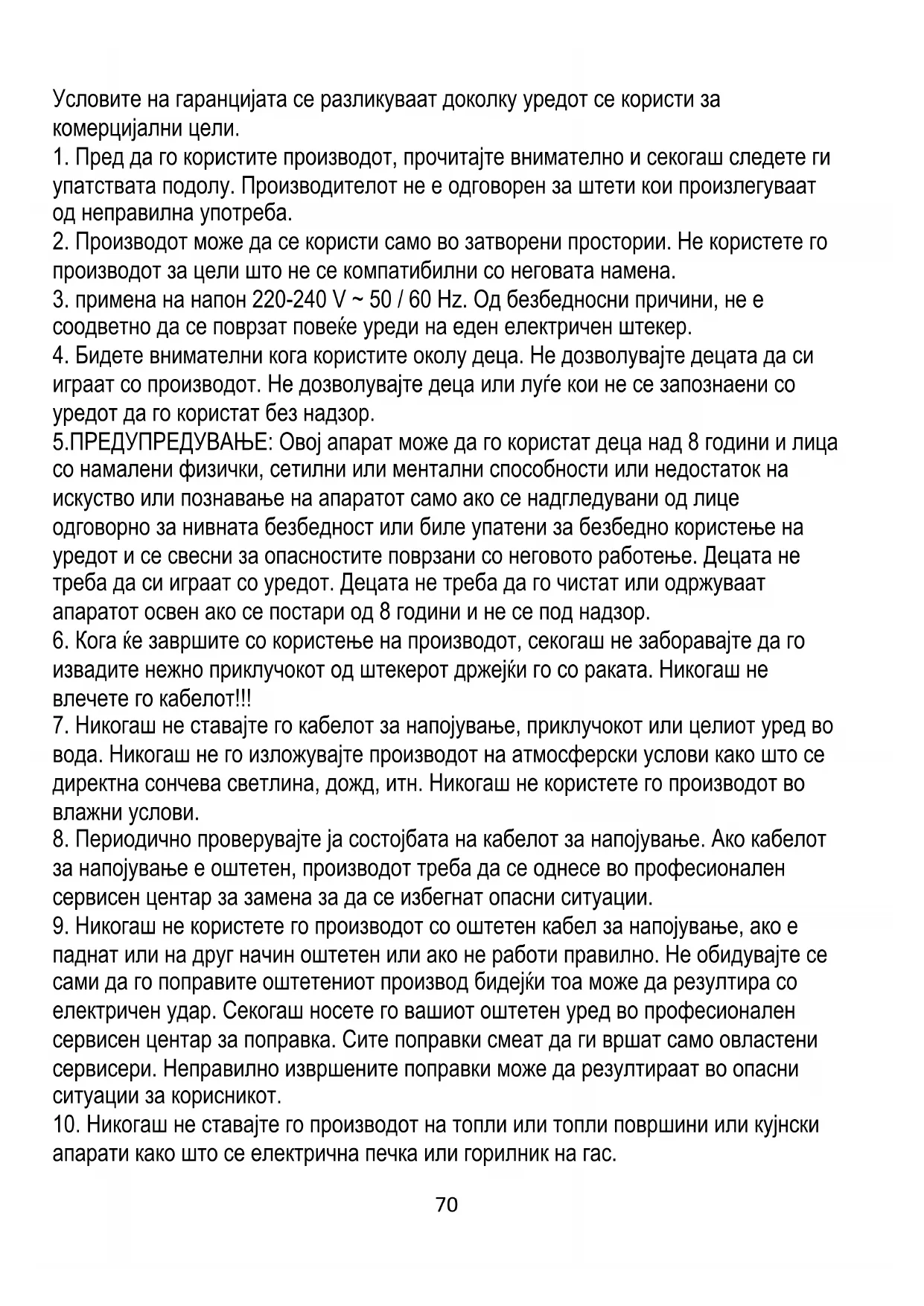 БЕЗБЕДНОСНИ УСЛОВИ ВАЖНИ БЕЗБЕДНОСНИ ИНСТРУКЦИИ ВЕ МОЛИМЕ ПРОЧИТАЈТЕ ВНИМАТЕЛНО И ЧУВАЈТЕ ЗА ИДНА РЕФЕРЕНЦИЈА70 Условите на гаранцијата се разликуваат доколку уредот се користи за комерцијални цели.