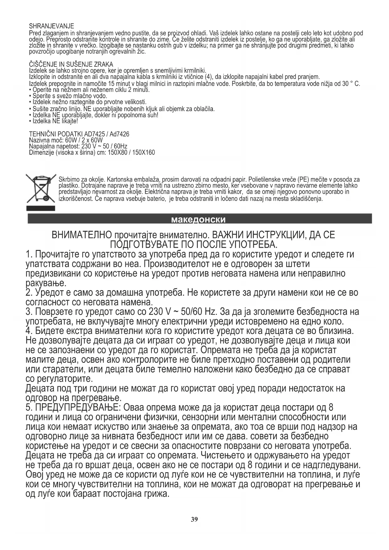 работи кога се користи во согласност со планираната употреба на опремата. Доколку прекинувачот се исклучи, уредот ќе престане да работи, опремата мора да се врати на производителот или неговиот претставник за поправка. Izdelek: Električna podloga AD7425 / Ad7426 ПРЕД ПРВАТА УПОТРЕБА
