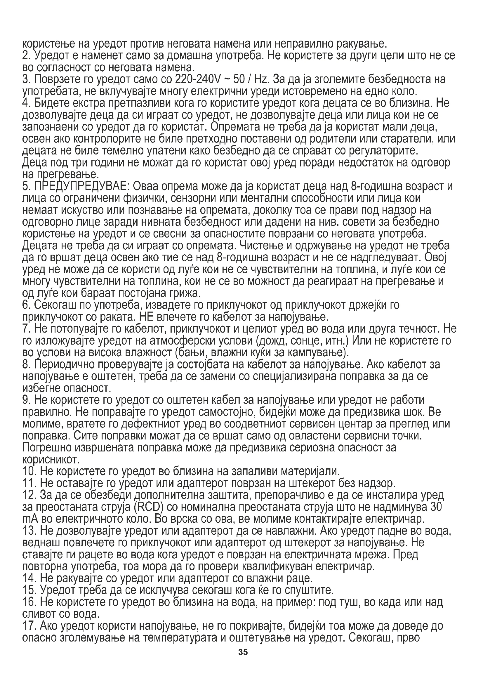 лица со ограничени физички, сензорни или ментални способности или лица кои немаат искуство или познавање на опремата, доколку тоа се прави под надзор на одговорно лице заради нивната безбедност или дадени на нив. совети за безбедно користење на уредот и се свесни за опасностите поврзани со неговата употреба. Децата не треба да си играат со опремата. Чистење и одржување на уредот не треба да го вршат деца освен ако тие се над 8-годишна возраст и не се надгледуваат. Овој уред не може да се користи од луѓе кои не се чувствителни на топлина, и луѓе кои се многу чувствителни на топлина, кои не се во можност да реагираат на прегревање и од луѓе кои бараат постојана грижа.