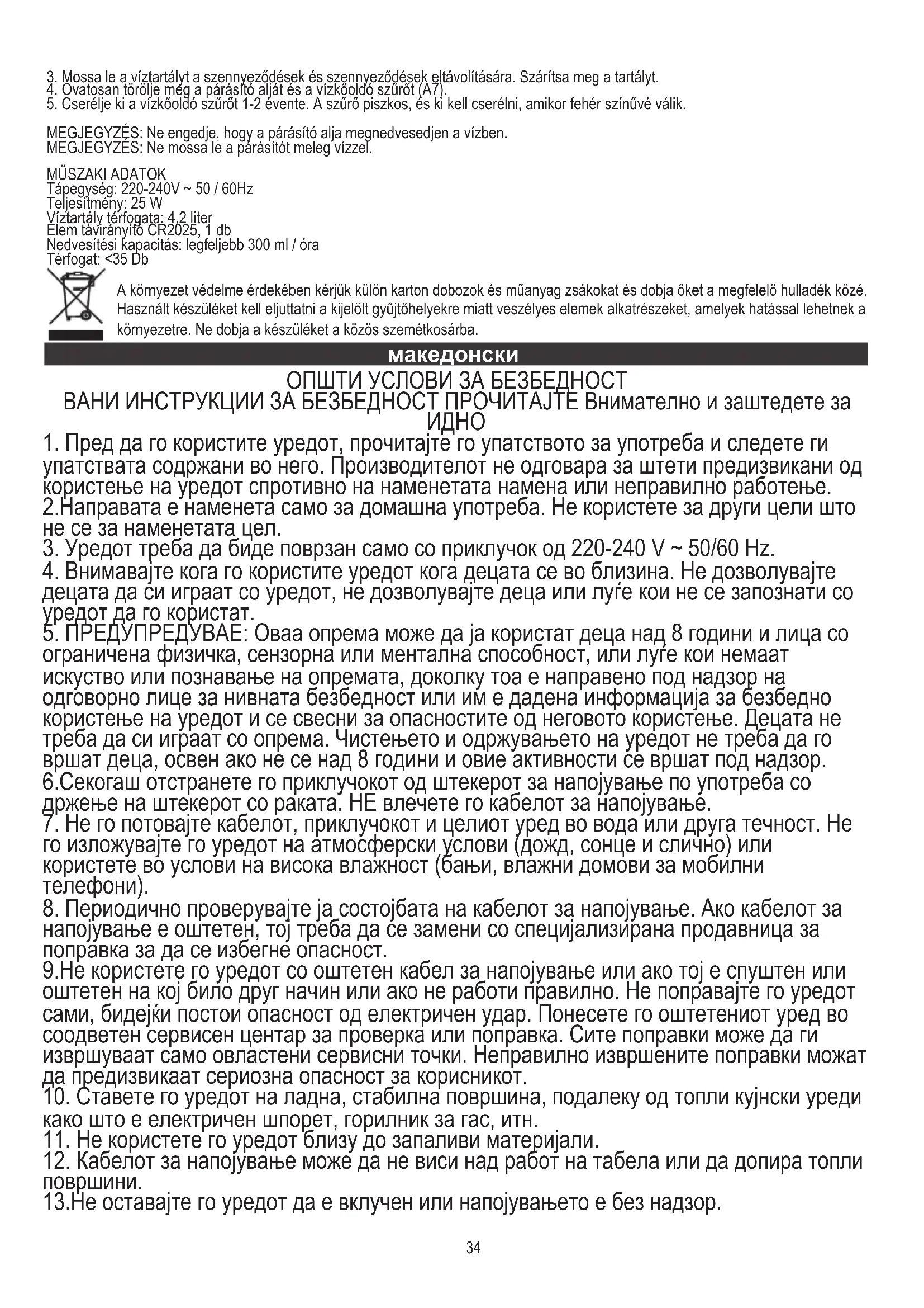 Белешка: Не дозволувајте основата на овлажнител да се навлажни во вода. ЗАБЕЛЕШКА: Не измивајте овлажнител со топла вода. ТЕХНИЧКИ ПОДАТОЦИ Напојување: 220-240V ~ 50 / 60Hz Моќност: 25 W Капацитет на резервоарот за вода: 4,2 литри Далечински управувач на батеријата CR2025 1 парче Капацитет на навлажнување: максимум 300 ml / час Обем: <35 Дб37 За да се заштитат вашата околина: ве молиме одделни кутии и пластични кеси и да располага со нив во соодветните канти за отпадоци. Користи апаратот треба да биде предаден на посветен собирање поени поради hazarsous компоненти, кои можат да влијаат на животната средина. Не фрлајте овој апарат во заедничката корпа за отпадоци.